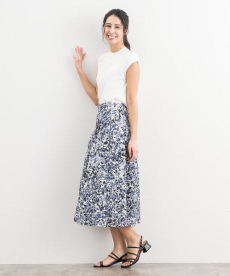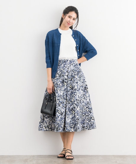 花柄スカートが上品な華やかさをプラス。シンプルながら女性らしいコーデに。