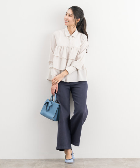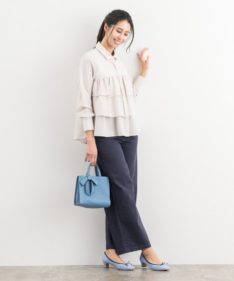 シンプルなネイビーのワイドパンツと合わせて、かわいいだけじゃないスタイリングに。