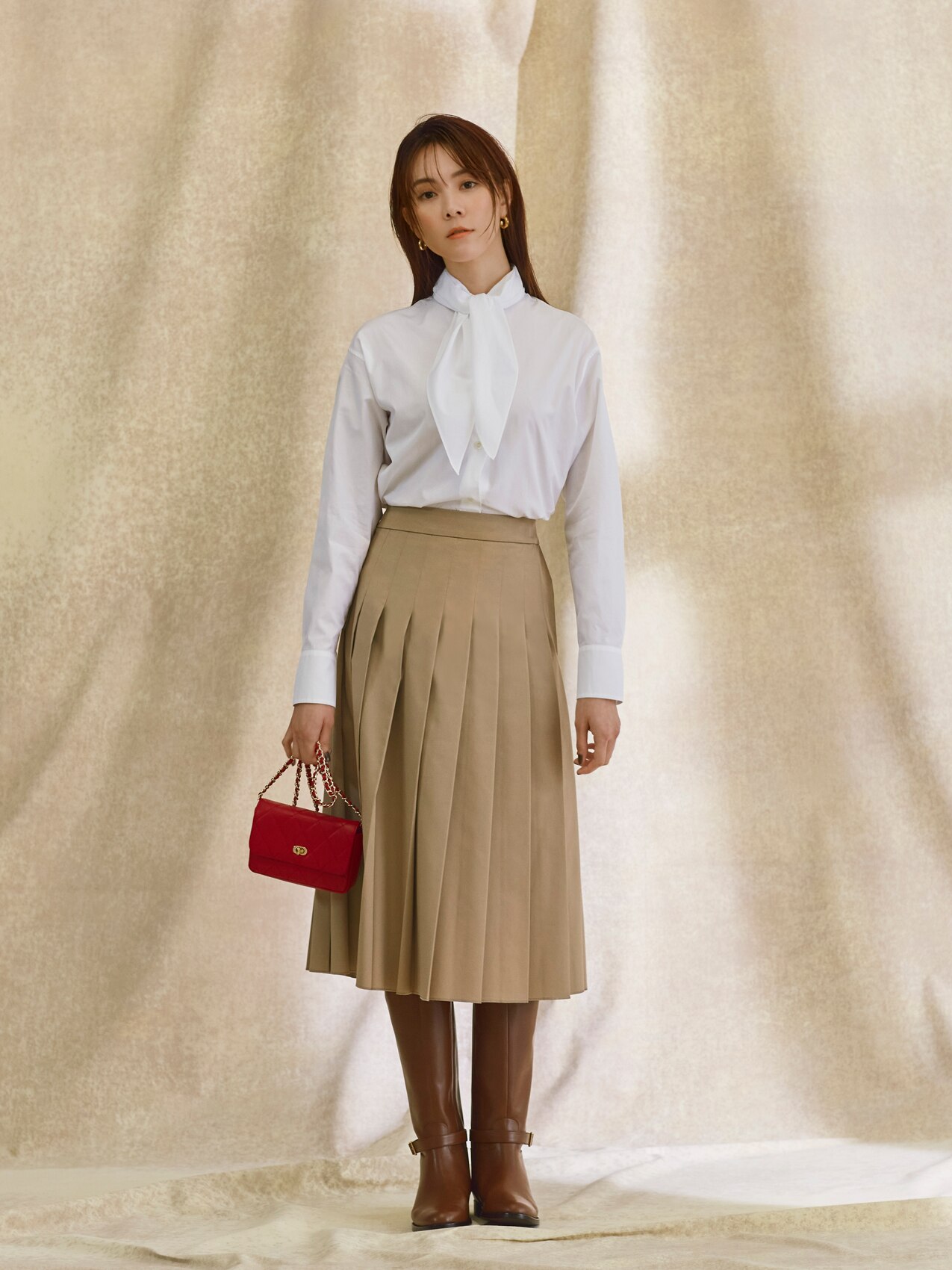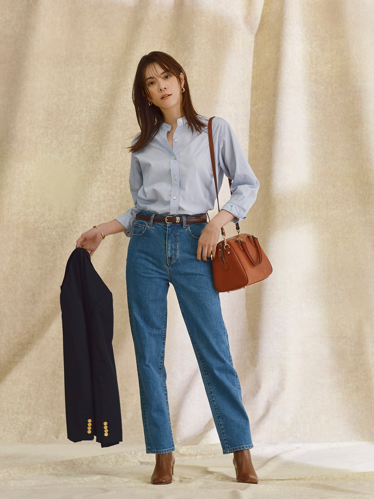 少し懐かしさを感じるクラシカルな装い。ミニマルサイズのバッグやシャツの素材感で今っぽくアップデートして。
