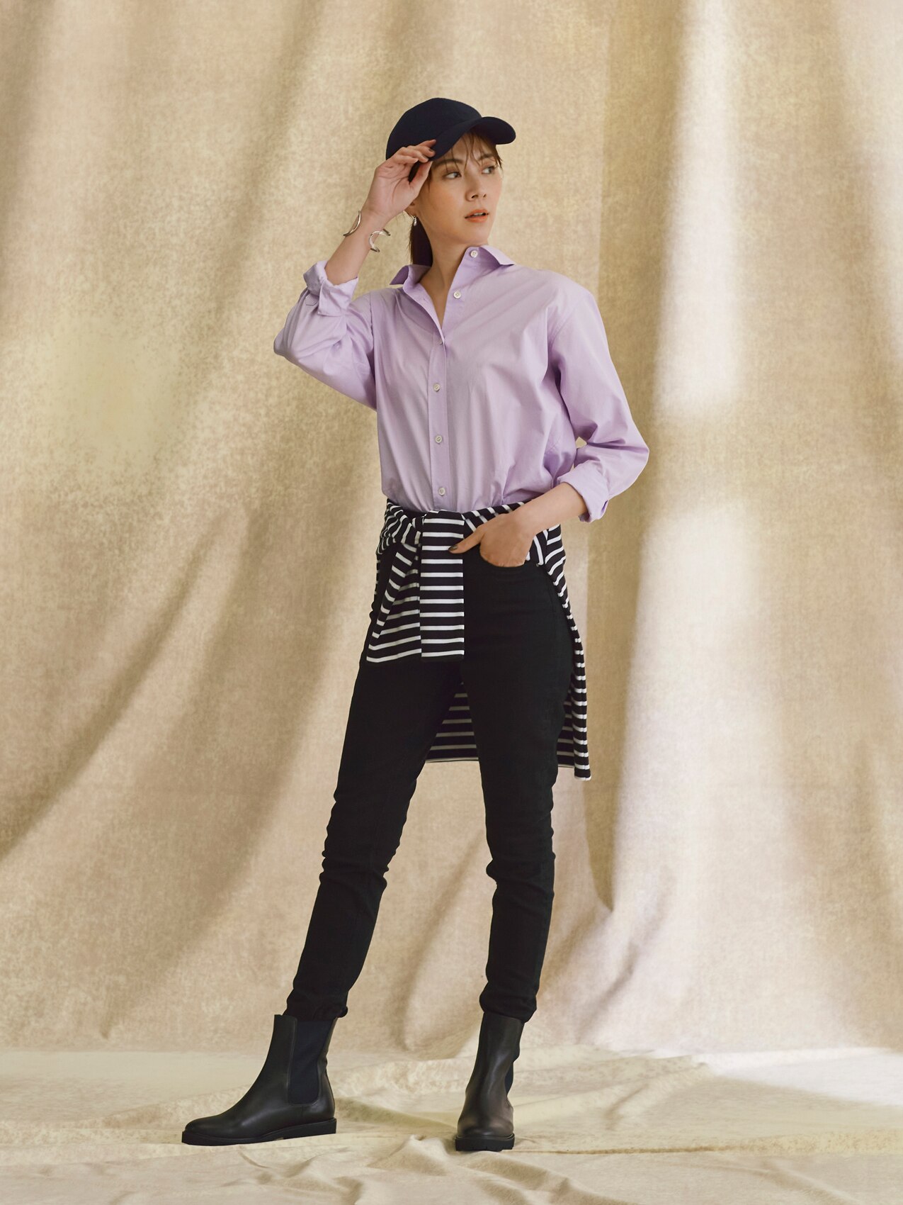 目を引く柔らかなラベンダーは、アクティブなスタイリングにすることで色の質感が引き立つ。