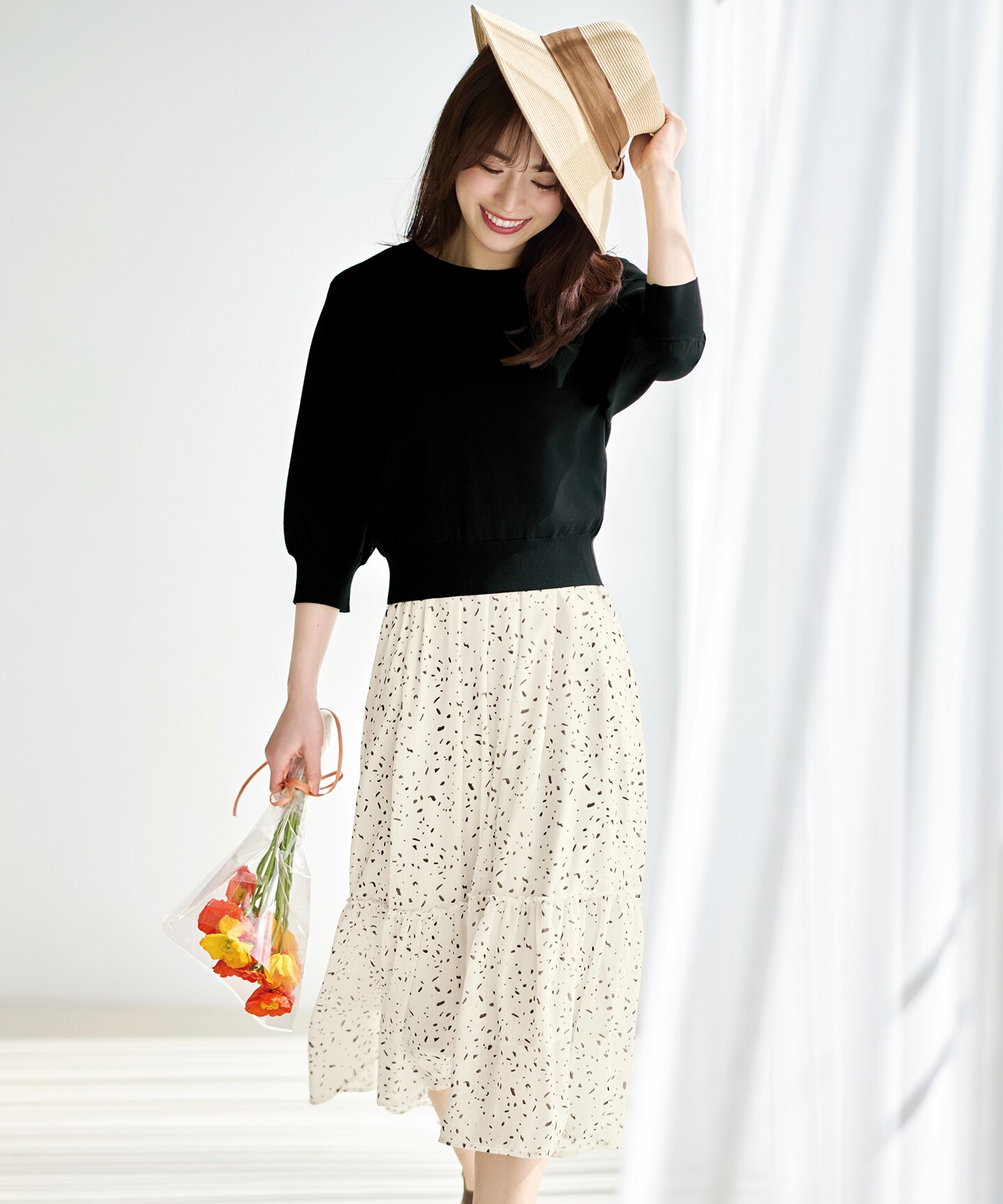 コンパクトなTOPSを合わせることで裾のティアードデザインが際立って好バランスに。