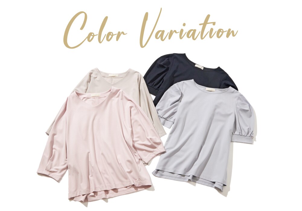 顔回りがすっきり見えるVネックと袖コンシャスなクルーネックの2型、それぞれ4色展開♪