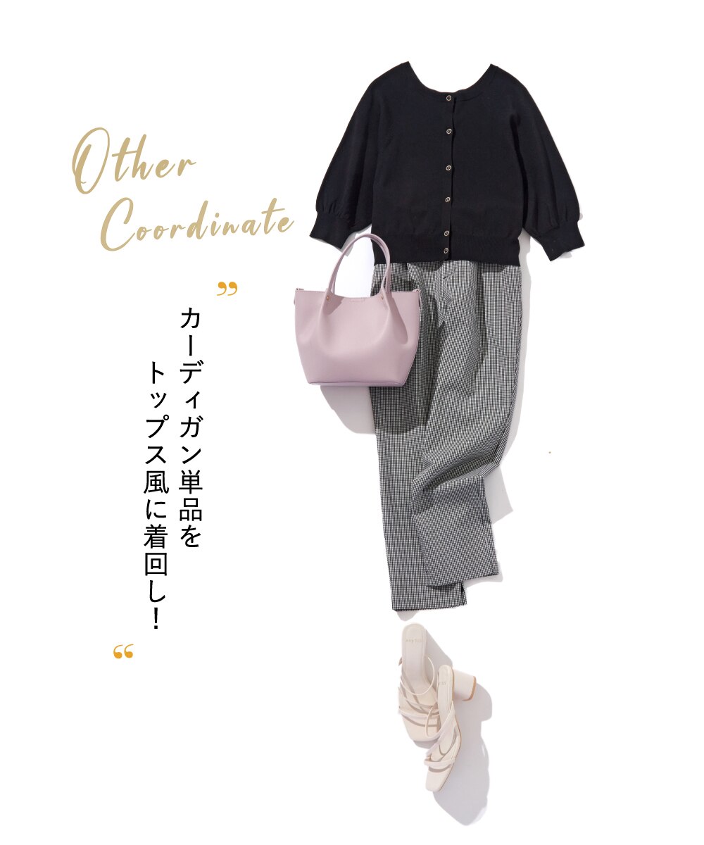 カーディガン単品をギンガムチェックのパンツと合わせたレディ好みなモノトーンコーデ。
