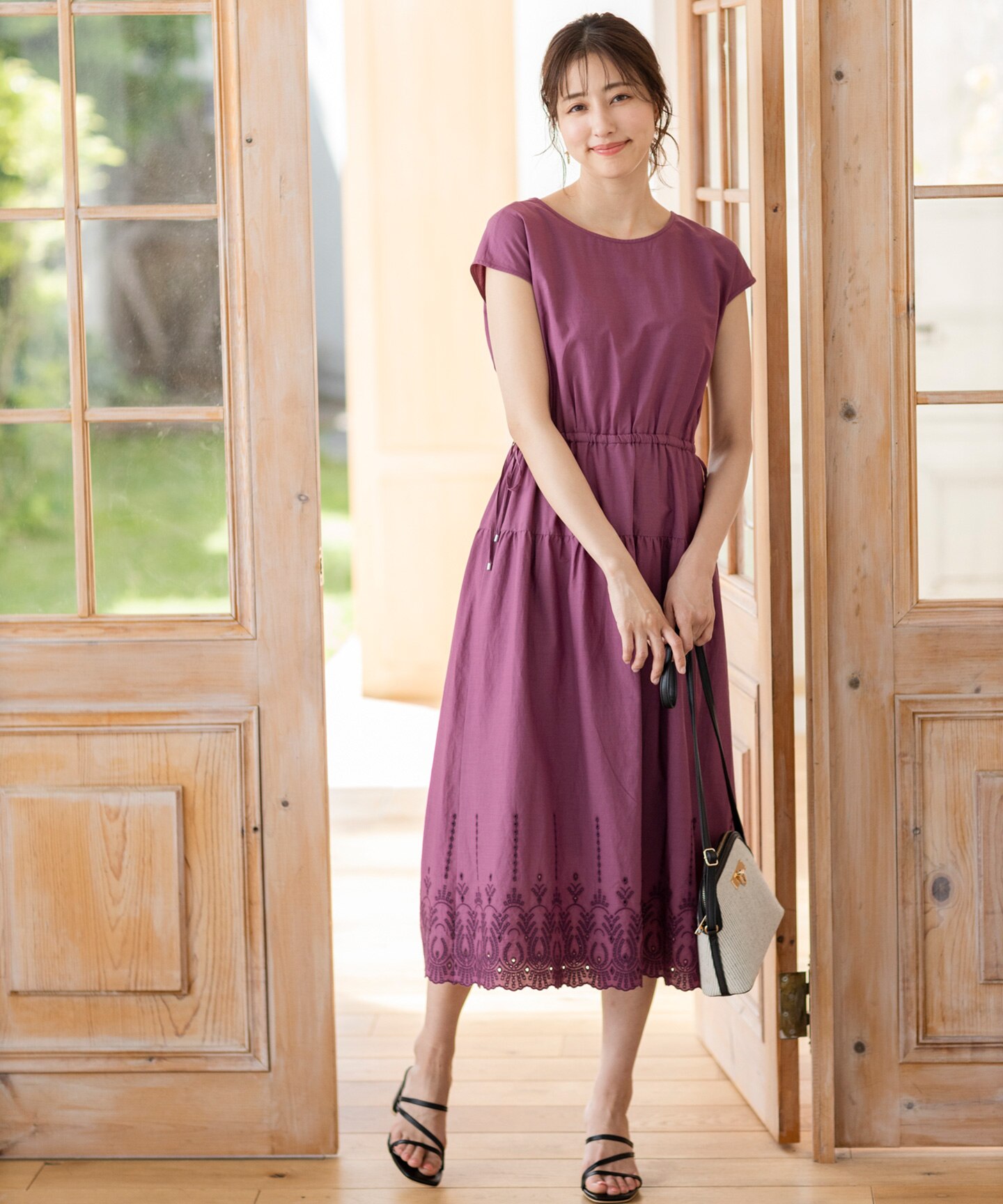裾に入った刺繍ディテールが目を惹くサマーワンピ。リボンでウエストを絞ってスタイルアップでき、