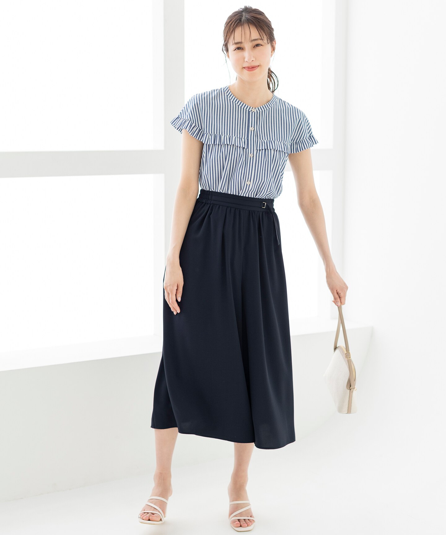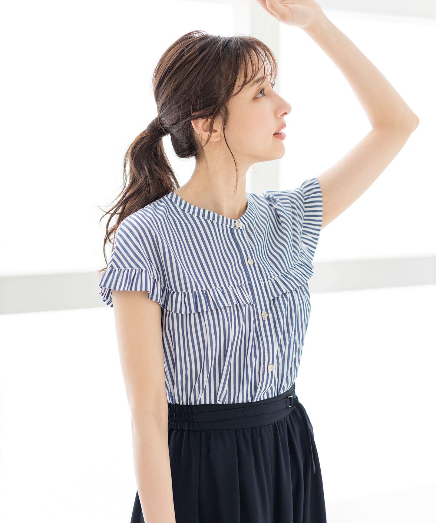 袖と胸元にあしらったミニフリルがポイントのストライプブラウス。