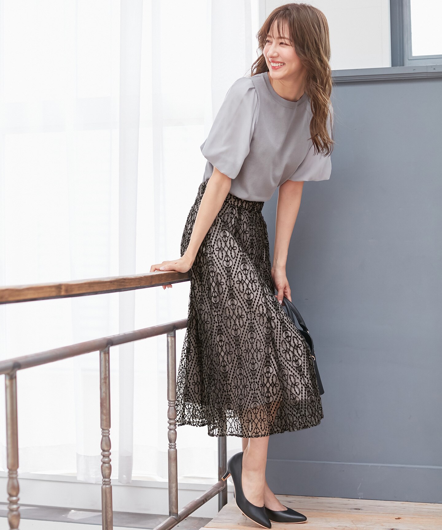 繊細な刺繍が目を惹く華やぎスカートに合わせて上品な着こなしに。