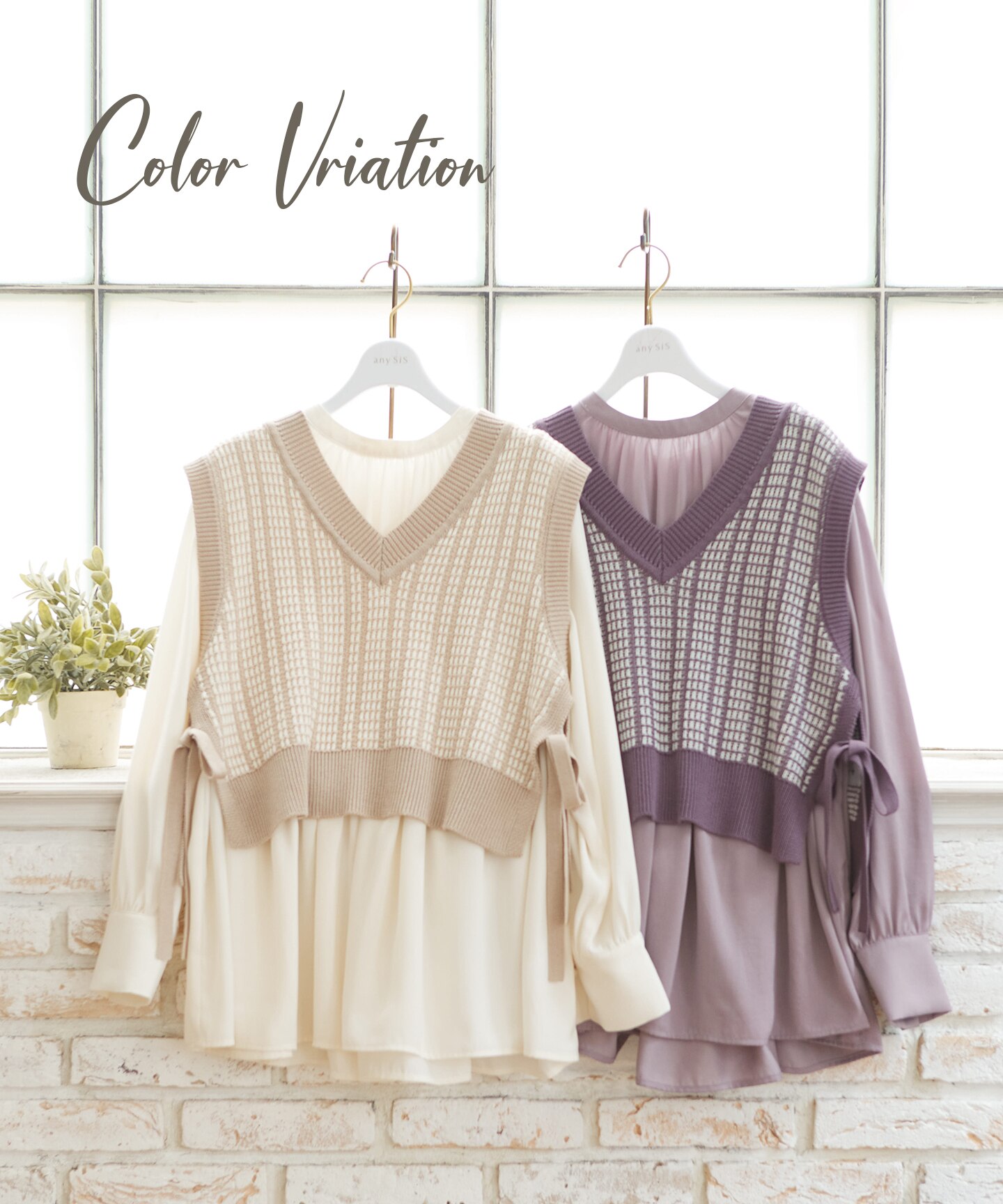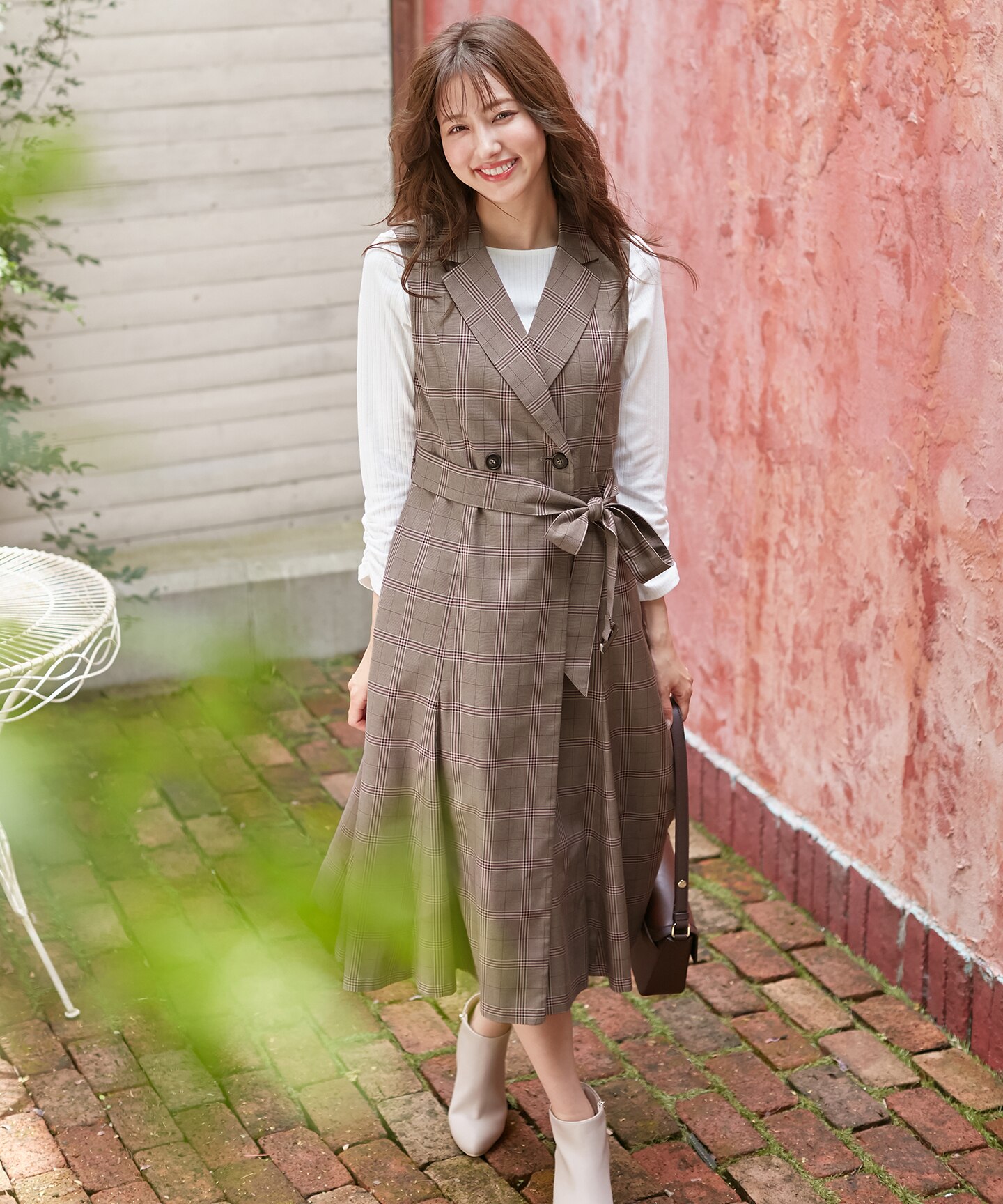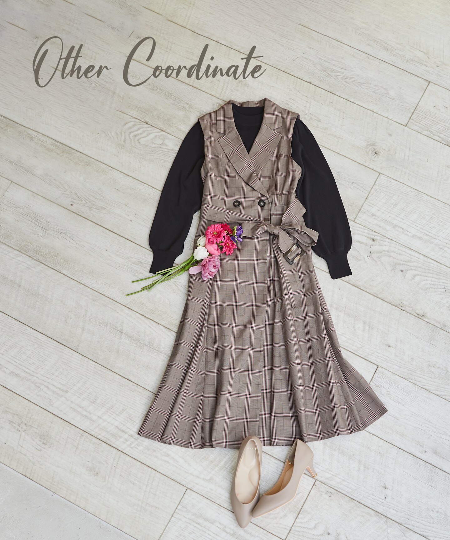 甘めブラウスに、チェック柄が可愛いベストを合わせた身に纏うだけで気分があがる1着。