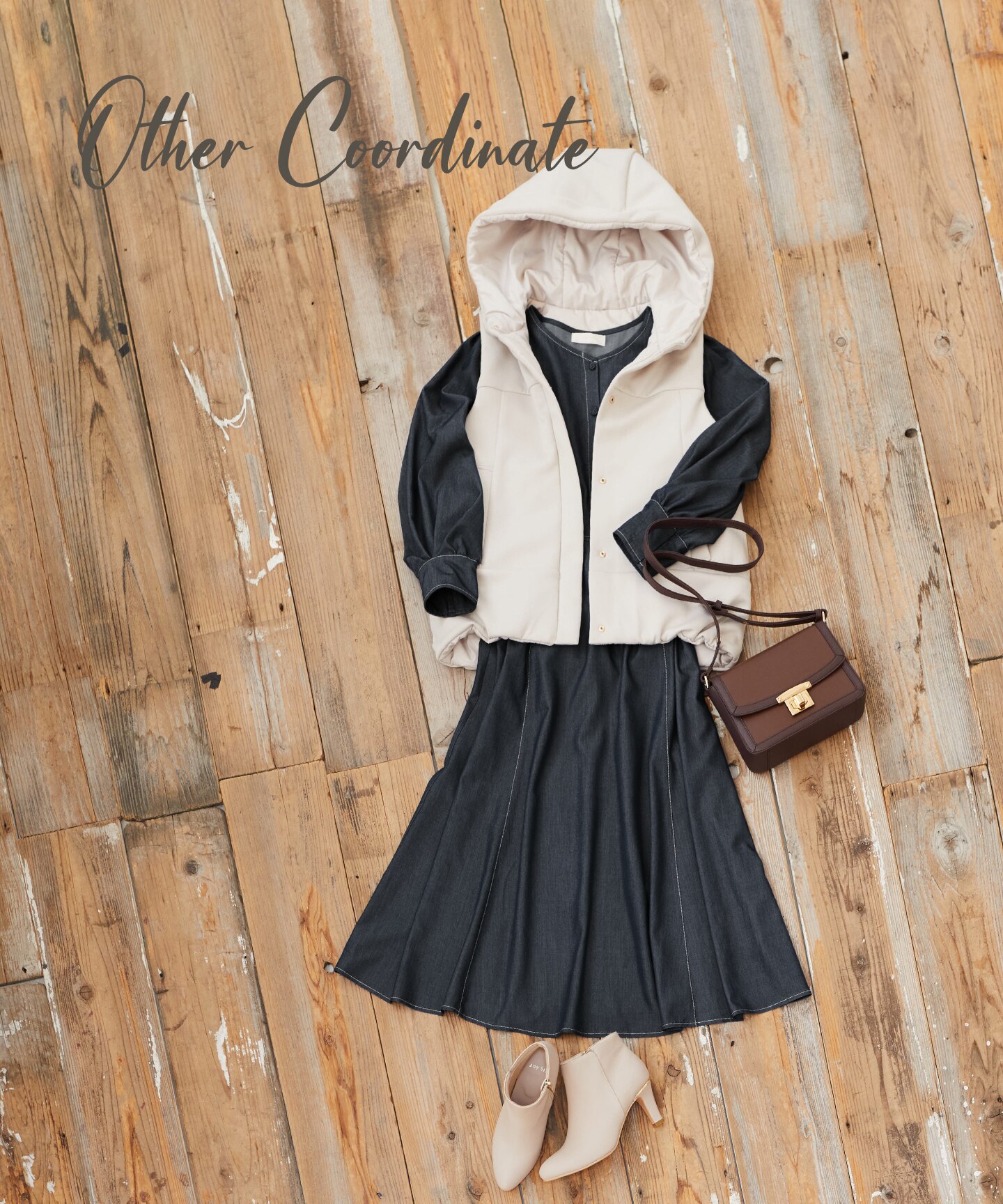 ミニマルなシルエットのダウンベストを羽織っておでかけコーデに。