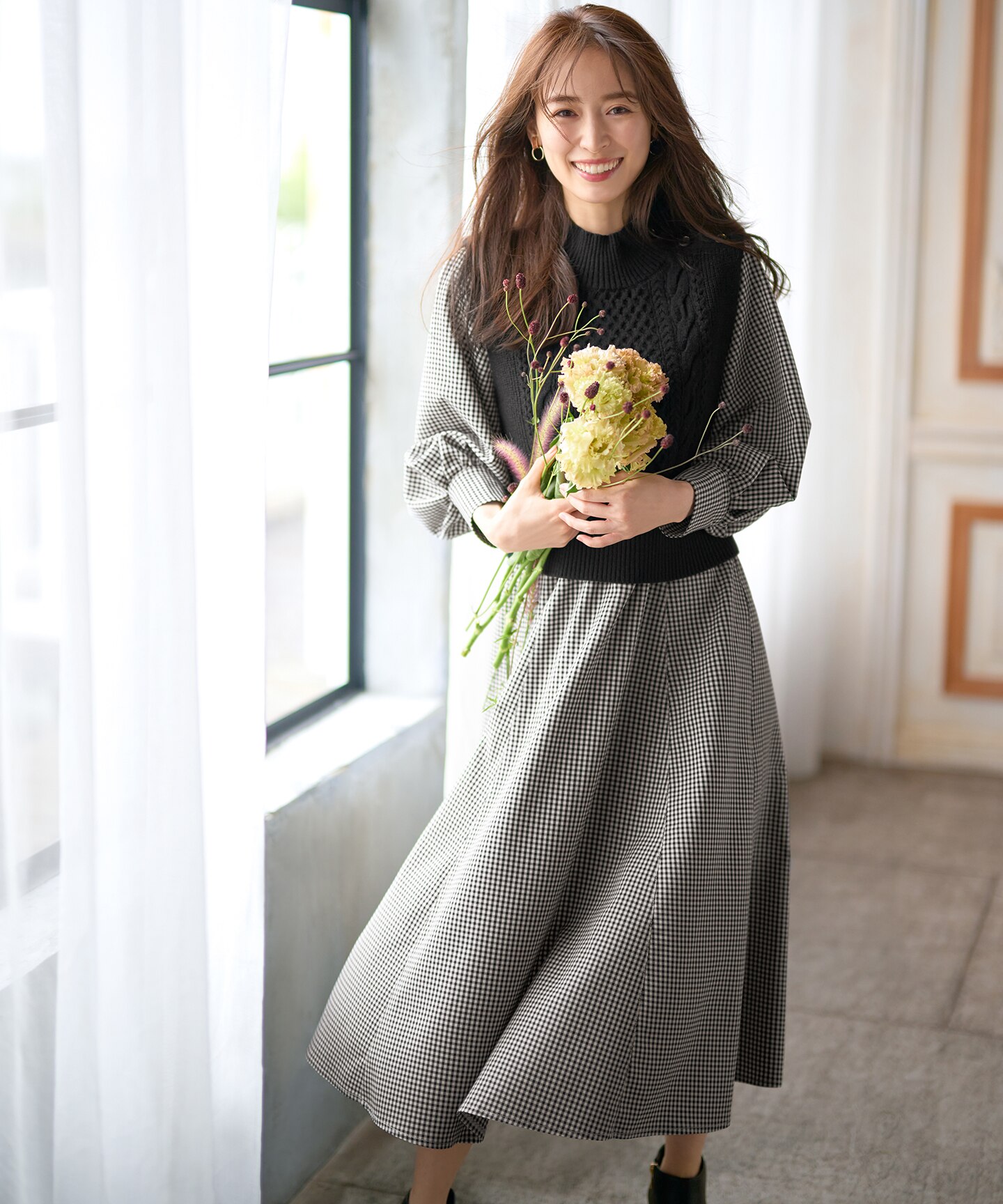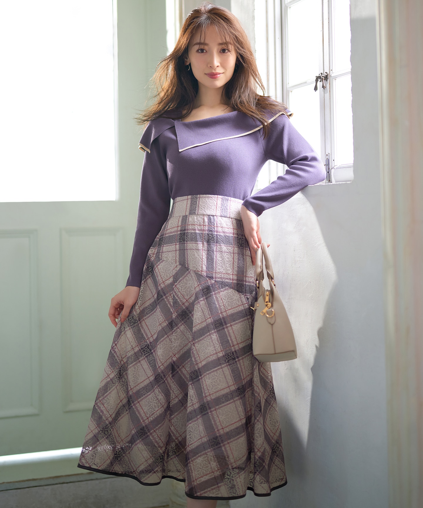 トレンドのフレアカラーニットに、映えスカートに合わせたとことんレディなスタイリング。