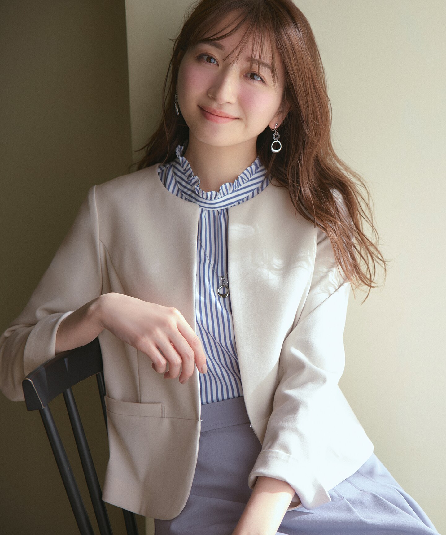 ノーカラージャケットからフリルを覗かせて、フェミニンで清潔感のあるコーデに!
