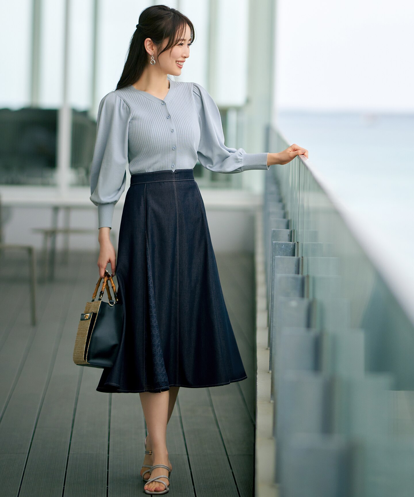ふんわりとしたパフスリーブに、大胆な花柄スカートを合わせてとびきりレディに。