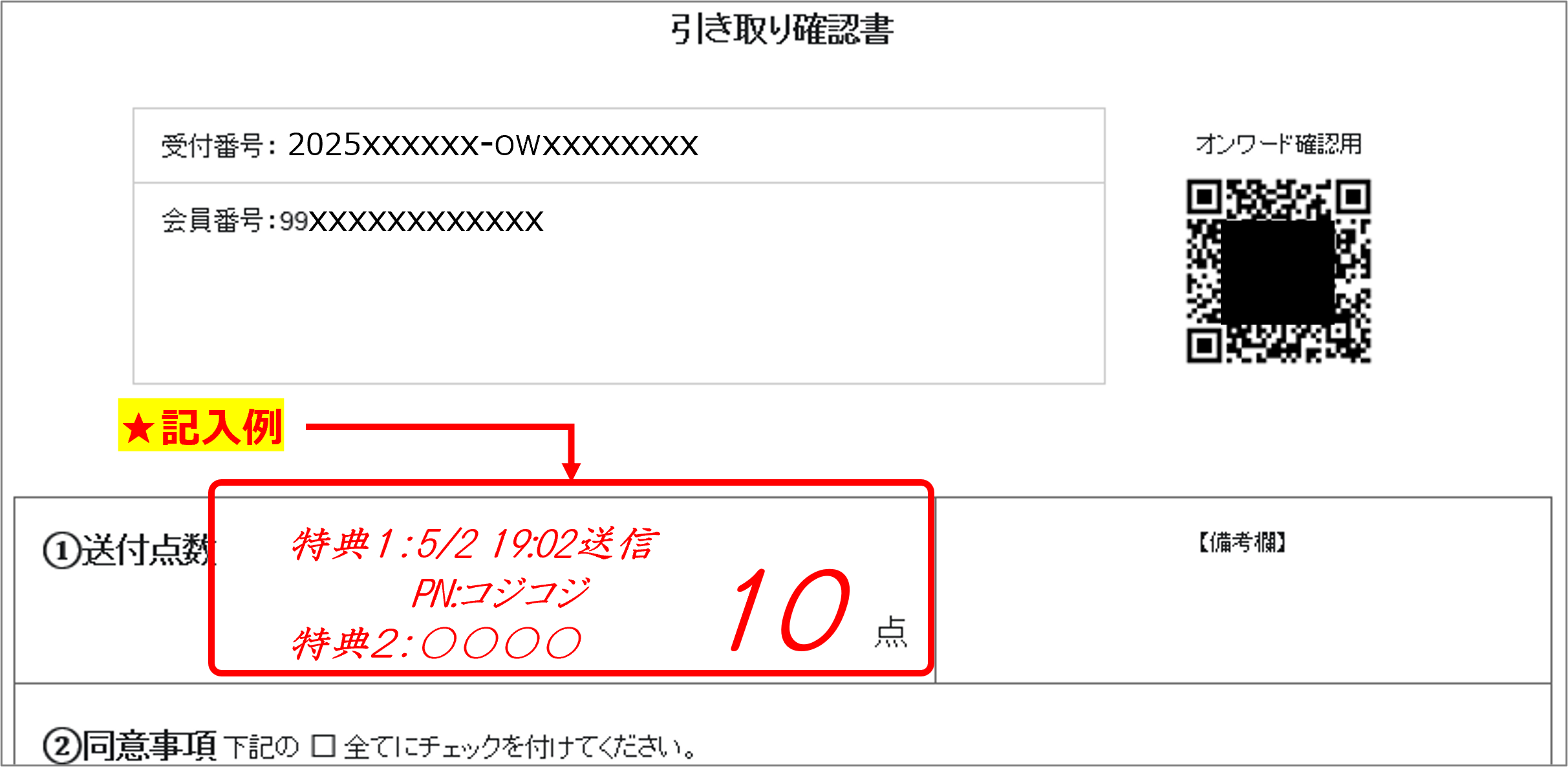 引き取り確認書の①欄に「○/○○:○送信」と明記し、ペンネーム(PN)、インスタのキーワード、送付点数を記入してください