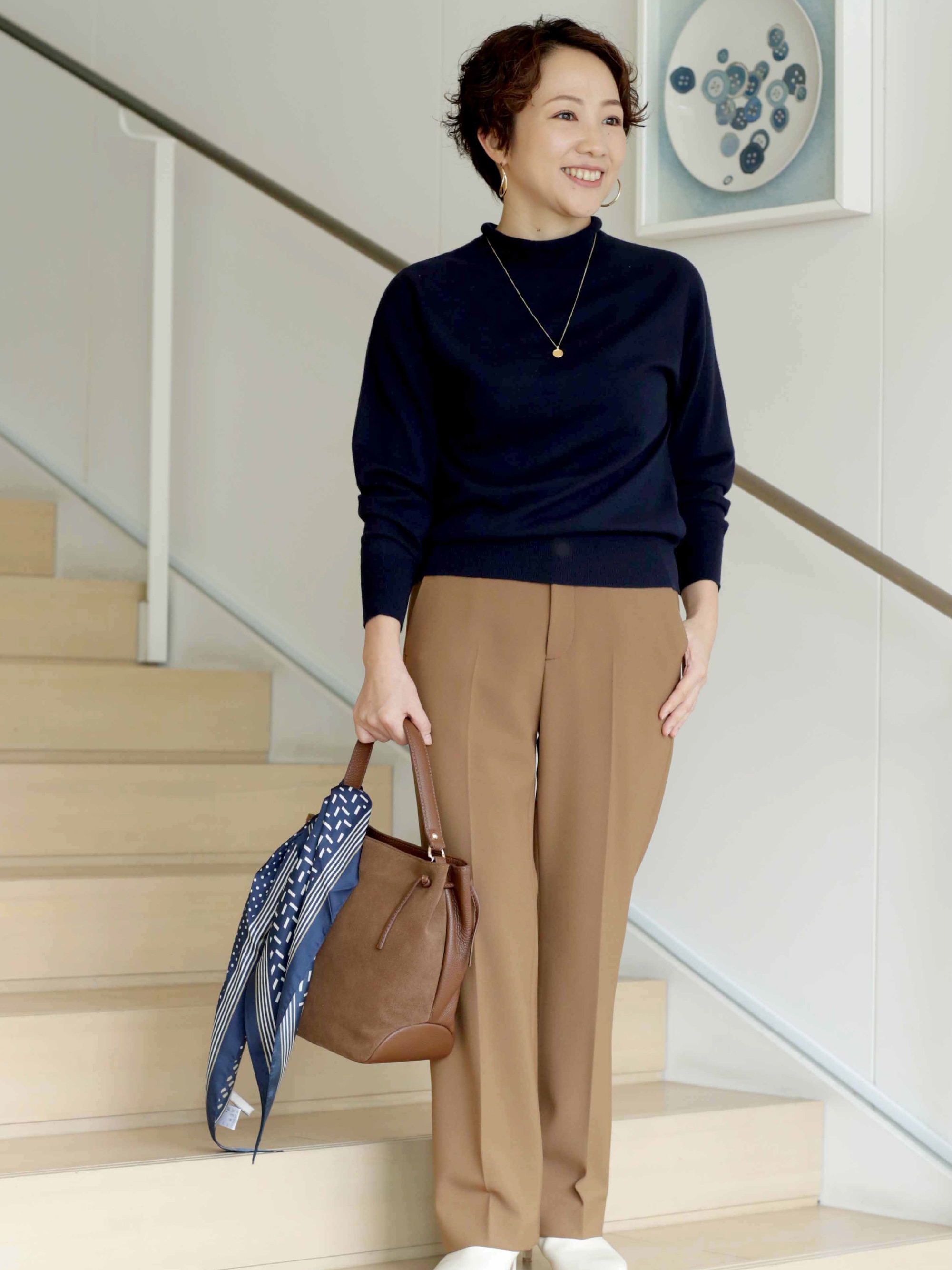 ジャストな丈のベージュのきれい目パンツ×ネイビートップスで大人の配色にまとめました。