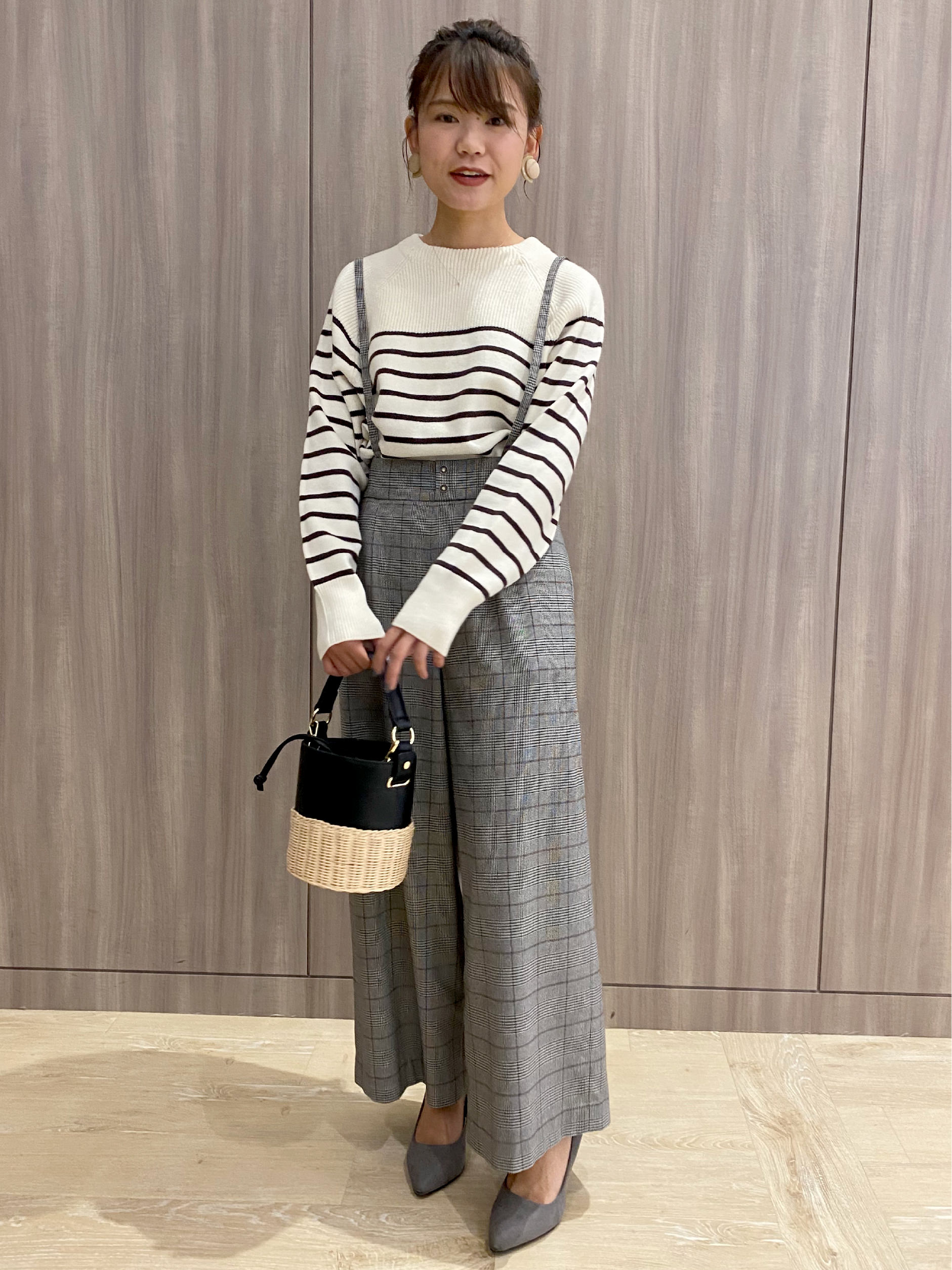 低身長さんが敬遠しがちなワイドパンツも、トップスをコンパクトにすればバランス◎。トップスをインすることで、腰位置がぐっと上がって脚長効果も!パンツは程よい落ち感が有る素材なので着心地がよく、下半身にボリュームが出すぎません。 上品なグレーチェックなので、ボーダーと合わせた柄×柄コーデでも大人っぽく着られます。