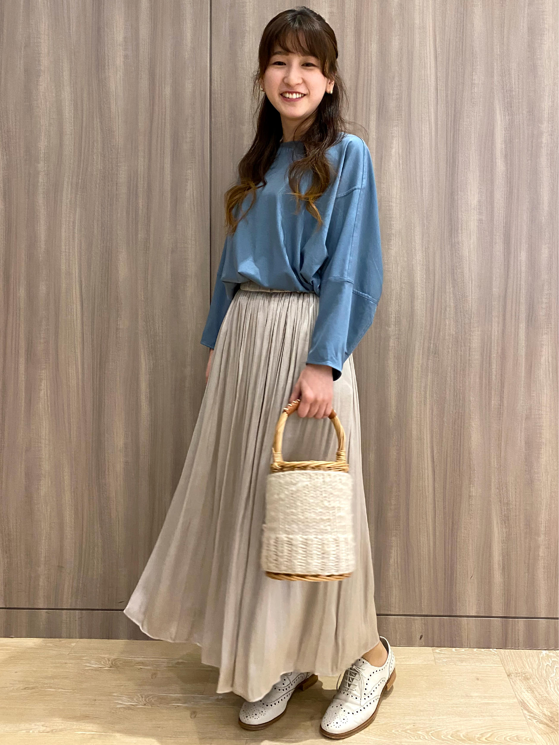 トップスを前だけインすることでロングスカートでもバランス良く見えます。靴はあえてローヒールでカジュアルな印象に。楽ちんなのにきれいめな印象のいいとこどりスタイル。柔らかい着心地が嬉しいスカートは淡いカラーを選んで軽やかに。細かいプリーツがIラインを強調してくれるおすすめアイテムです。