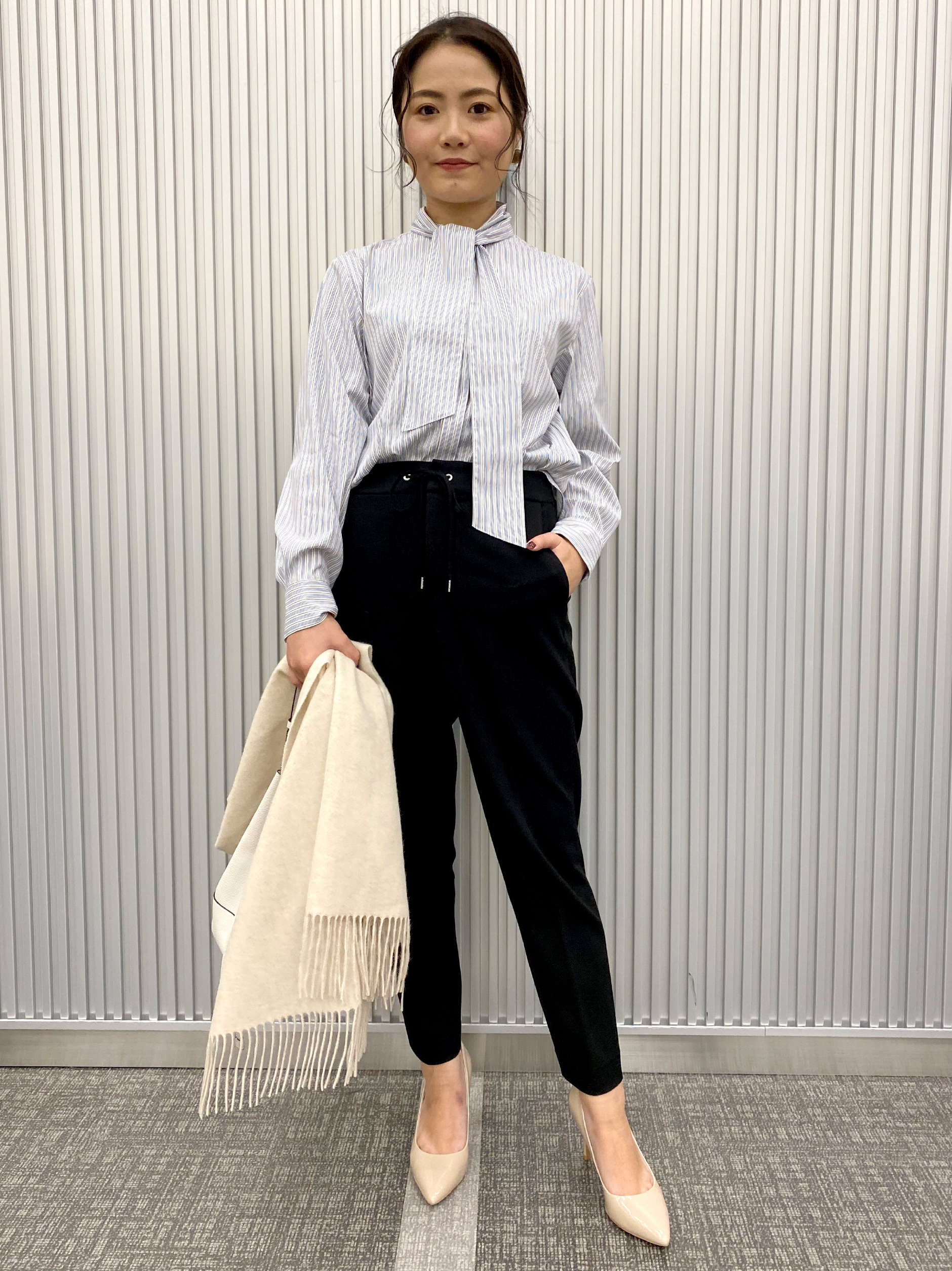 きれいなシルエットのテーパードパンツはぴったりサイズを選び、逆にシャツはビッグ系シルエットを選んで今っぽさを!ヒールパンプスを合わせることで、こなれ感を出しつつスタイルアップ見せが可能です。顔周りにアクセントを持たせたボウタイシャツを合わせて目線を上に、前だけINすることで、全体のバランスもきれいに見えます。