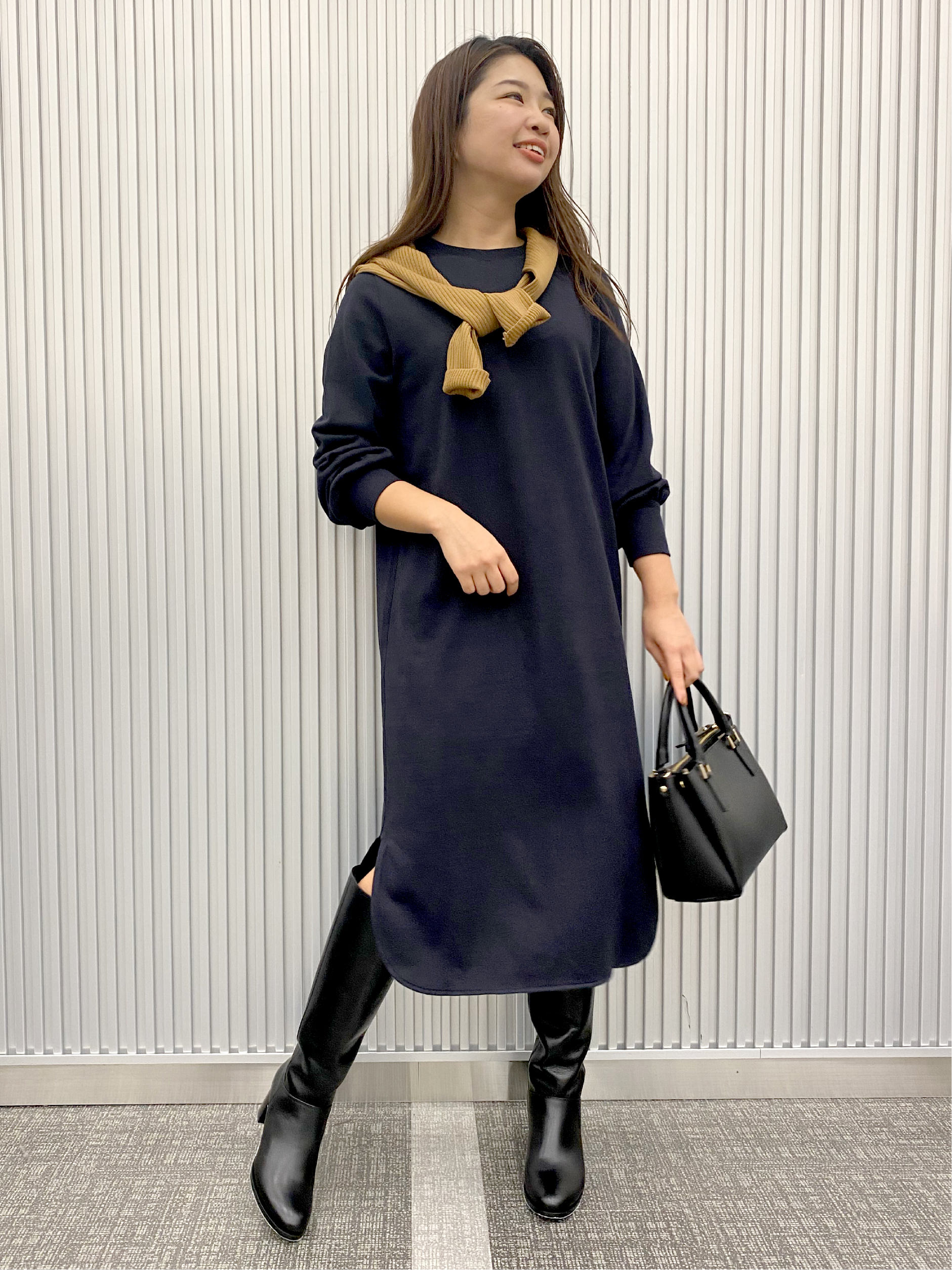 ひざ下丈のワンピ―スはバランス重視でロングブーツをセレクト。色のトーンを合わせて着ると縦のラインができて、スラッと見えます。肩がけニットはコントラストがつくカラーを選び目線を上に!裾は抜け感をプラスするスリット入りなので、長めの丈でも動きが出て軽やかに。