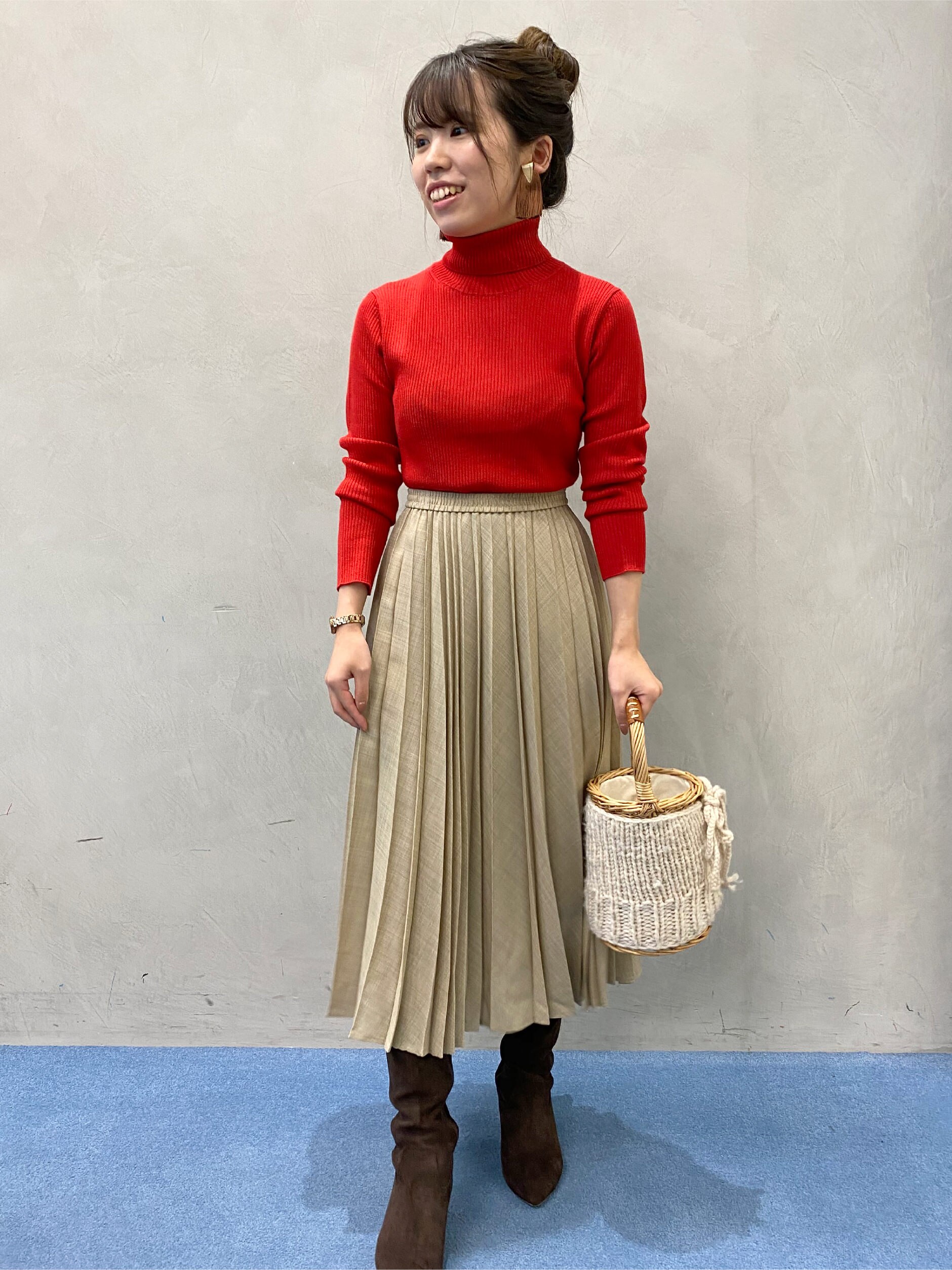 カラートップスとアップヘア、大きめのピアスで目線を上に上げれば、小柄でも全体のバランスがよくなります。赤いニットはベージュやブラウンと合わせることで、やわらかい印象に。また、この冬外せないのがロングブーツ!即旬顔になれるロングブーツは、優しい印象のスカートと合わせれば重く見えません。