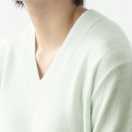 顔回りが優しく映るCeladonのニットは、腰回りを隠しつつすっきりと見せてくれる秀逸デザイン。