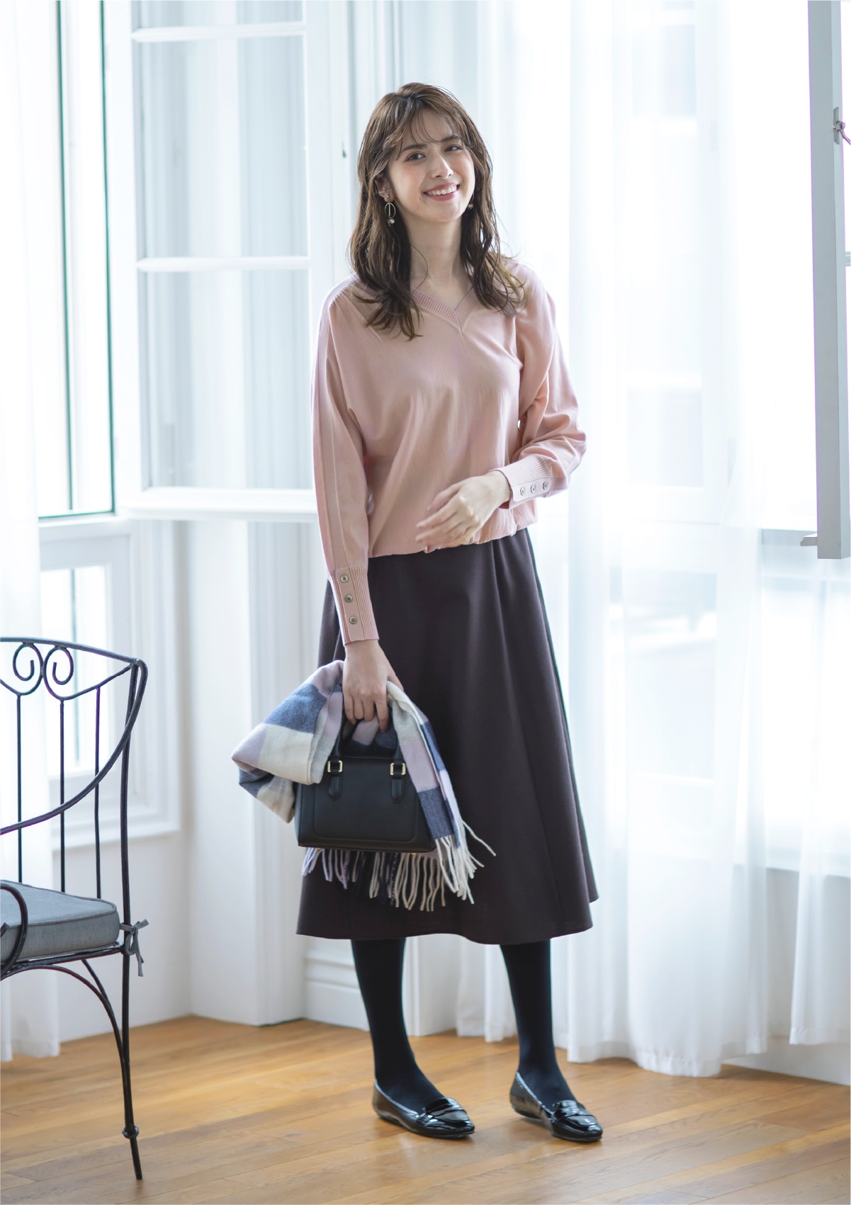 上品さは残しながらリラックス感があるドルマンVニット。華やかなピンクは、ブラウンのスカート合わせでビターな甘さに。