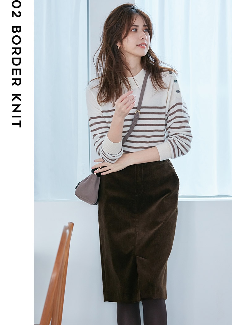 カシミヤ混のふんわり素材が心地よい、ボーダーと肩ボタンが愛らしいプルオーバーニット。単調になりがちなボーダーもブラウン配色なら脱定番を狙えそう。全体を茶系に合わせて統一感を出したら、キレイ目な印象に。