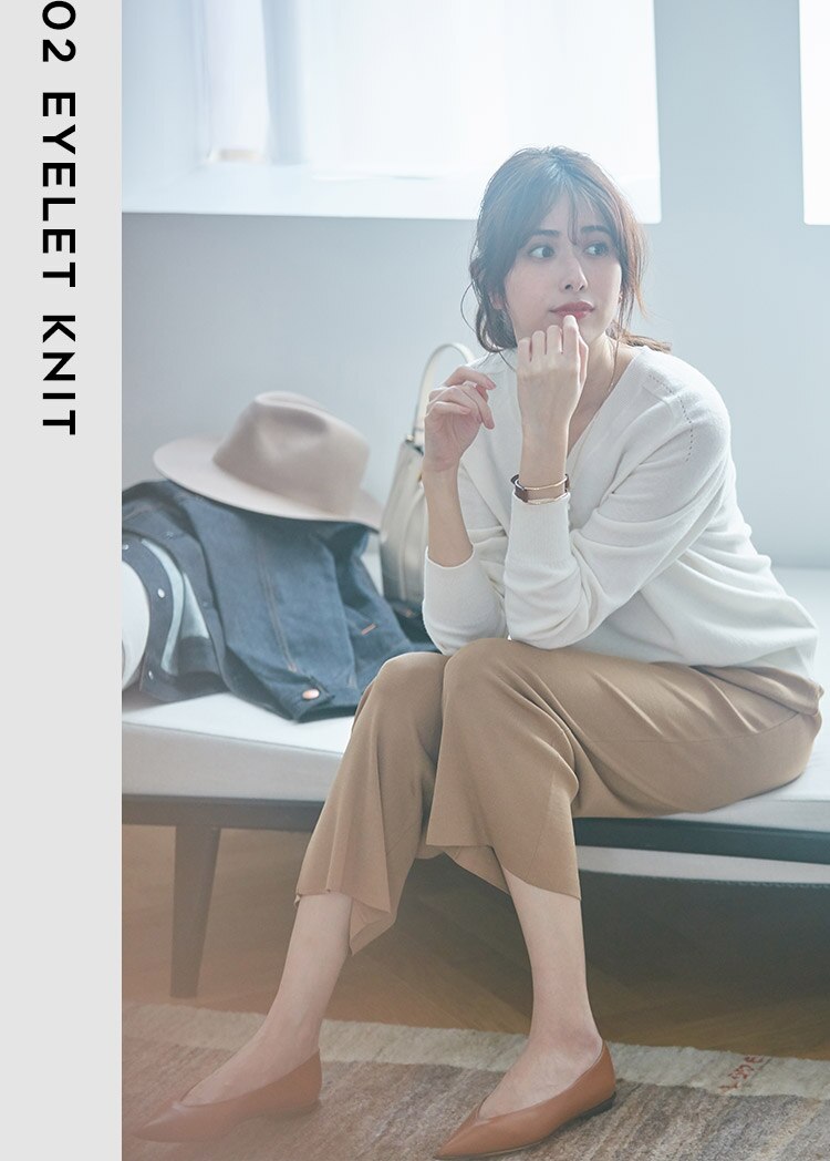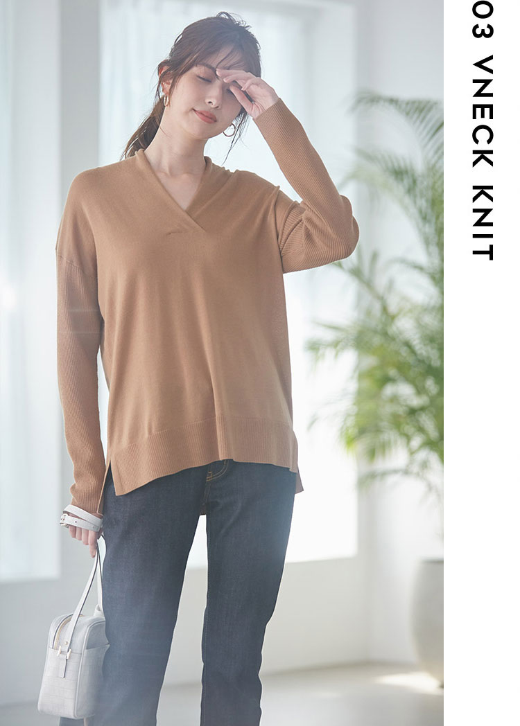 今こそアップデートしたい定番Vネックニットには肩部分にさりげない編み模様を施し、シンプルな中にこだわりを。カシミヤ混のリッチな肌触りが、おうち時間にも最適。ONOFF使えるニットパンツでゆったりさをプラスしてみて。
