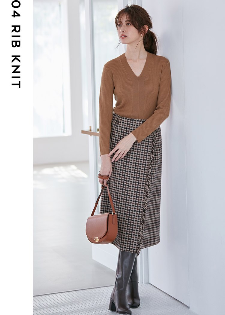 エレガントに着こなすこなれVネックニット。リブ&大胆な編地デザインが他とは一線を画すデザインで、顔回りをすっきり見せてくれる効果も。フリンジチェックのスカートとロングブーツとの組み合わせが今年らしくて新鮮。
