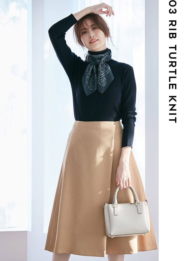 レイヤースタイルにも大活躍の頼れるタートルニット。一枚持っているだけで、主役から脇役まで幅広いシーンで活躍してくれること間違いなし。光沢感のあるスカートとスカーフがシンプルなリブニットを格上げしてくれる。