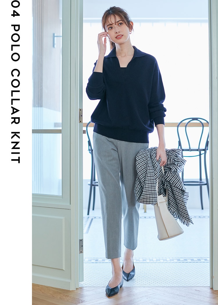 マニッシュなのにどこか女性らしい、ポロ襟ニット。シャツを着る感覚でニットを着られるので、ワードローブのNEWフェイスとして加えたい一枚。キレイ目ボトムはもちろん、デニムやスカートとの相性も抜群。