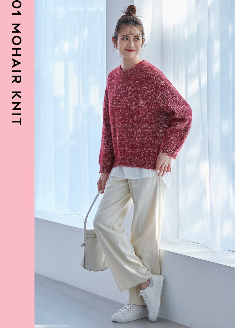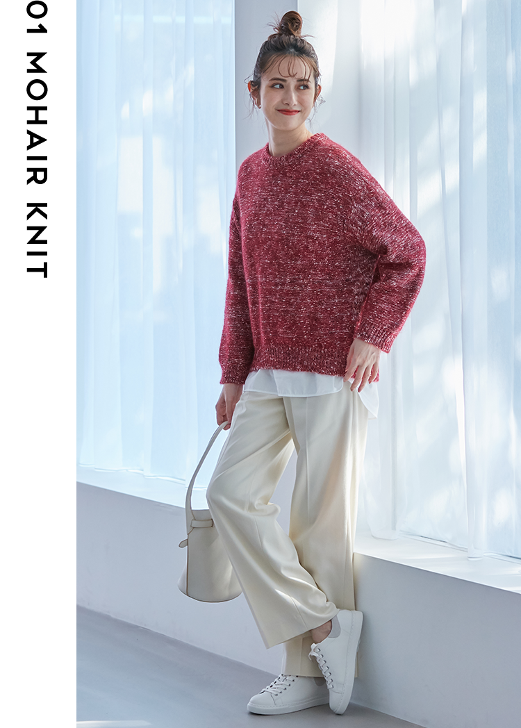 ミックス編みが愛らしい、秋冬の主役級ニット。前後差をつけたコクーンシルエットや、ゆったりとした袖ラインが立体感を演出してくれる。今っぽいシャツとのレイヤードがトップスの甘さに変化球を加えてくれそう。