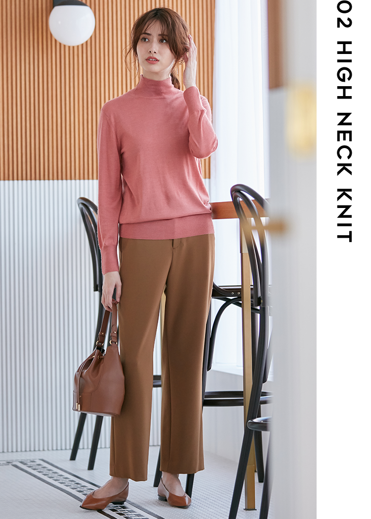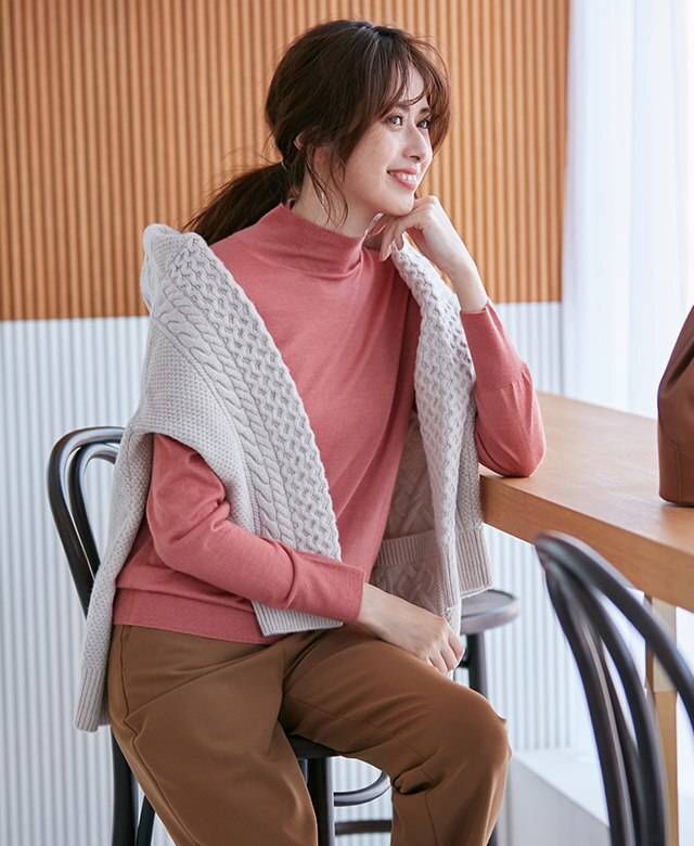 おしゃれ名手には欠かせない、カシミヤ混のあたたかいハイネックニット。シンプルでロングシーズン着用でき、飽きのこないタイムレスなデザインも魅力的。オレンジ味がかったピンクはキャメルとの相性が◎