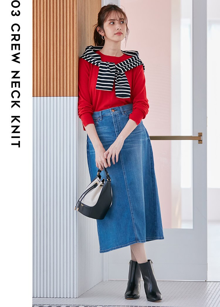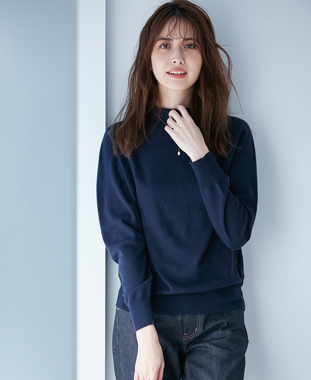 襟の重ねデザインが一味違ったニットスタイルを演出。履き心地の良い23区定番のデニムとの掛け合わせは、ほっと一息つける休日スタイリングにも最適。