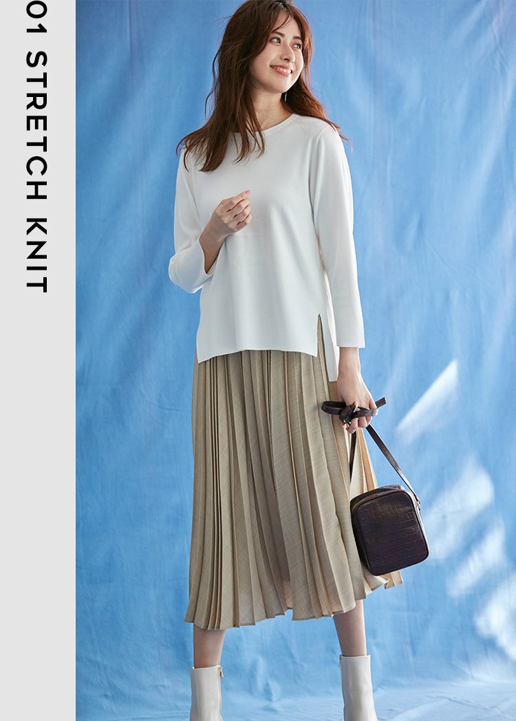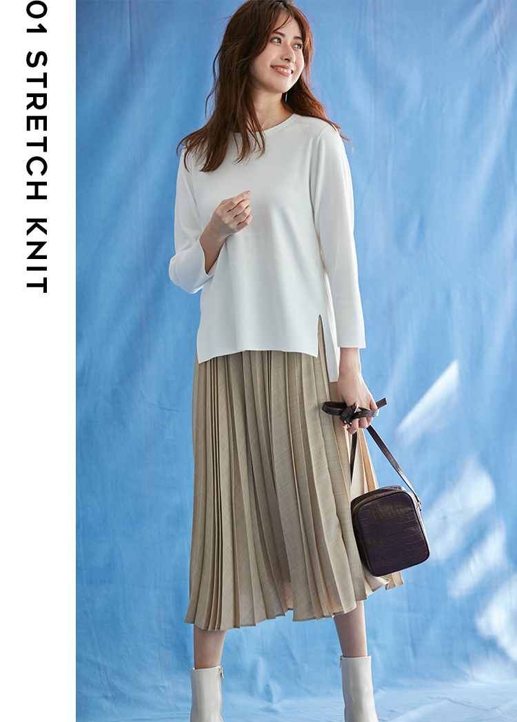 無縫製のシームレスで仕上げた着心地の良いプルオーバーニット。ナチュラルな襟の丸まり感が可愛いデザイン。トップスとボトムス・ストールとバックで色を揃えて上品に、足元でカラーをプラスしてポイントに。
