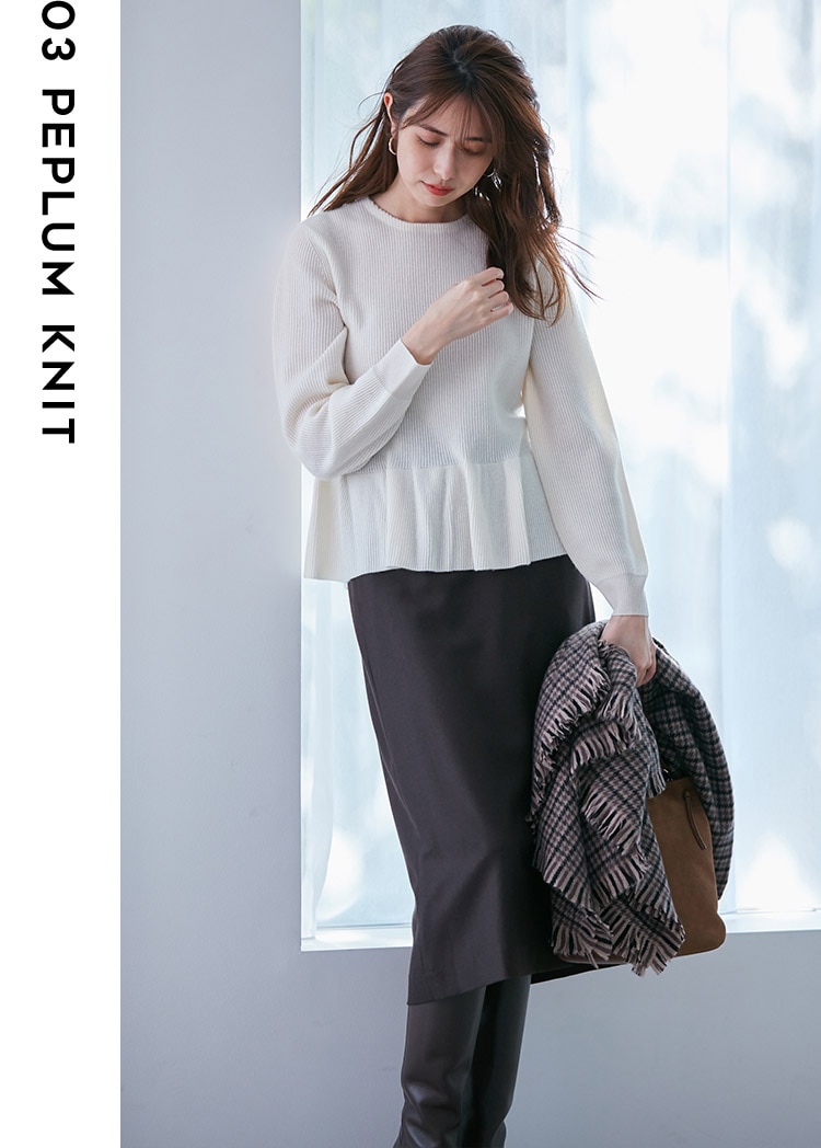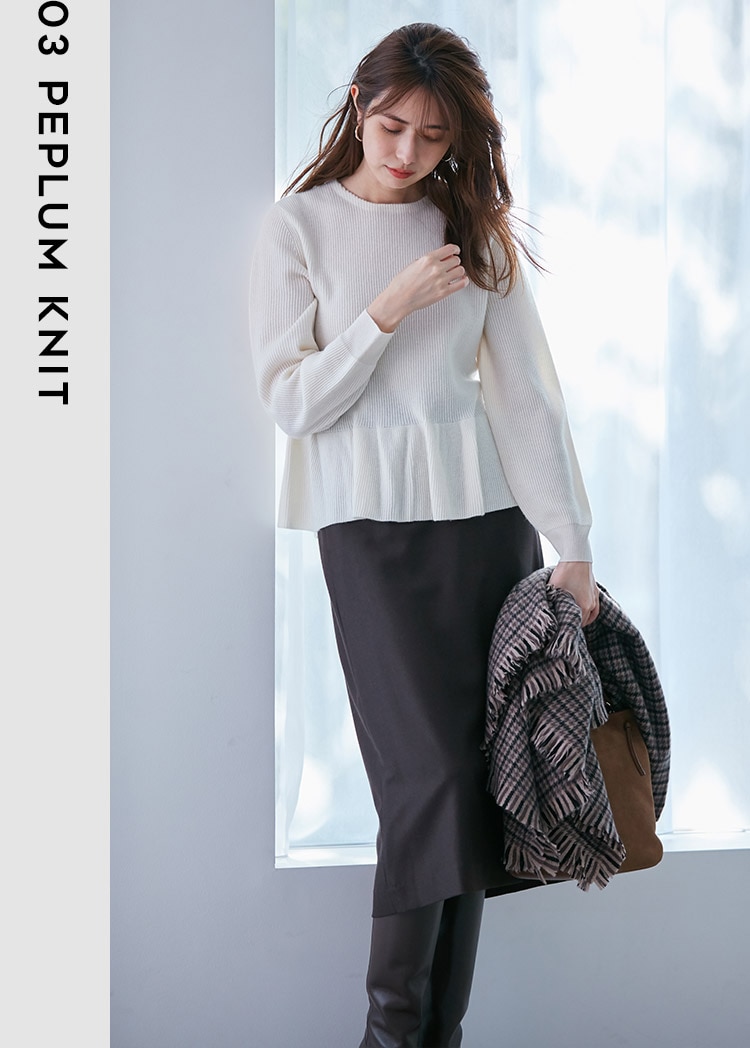 コンパクトな襟に女性らしいペプラムシルエット、計算されたデザインに気分が上がる。甘さのあるニットには、女らしさがきちんと残る細身の茶色スカートが今の気分にマッチ。かわいいとカッコいいが同居するコーディネートが◎