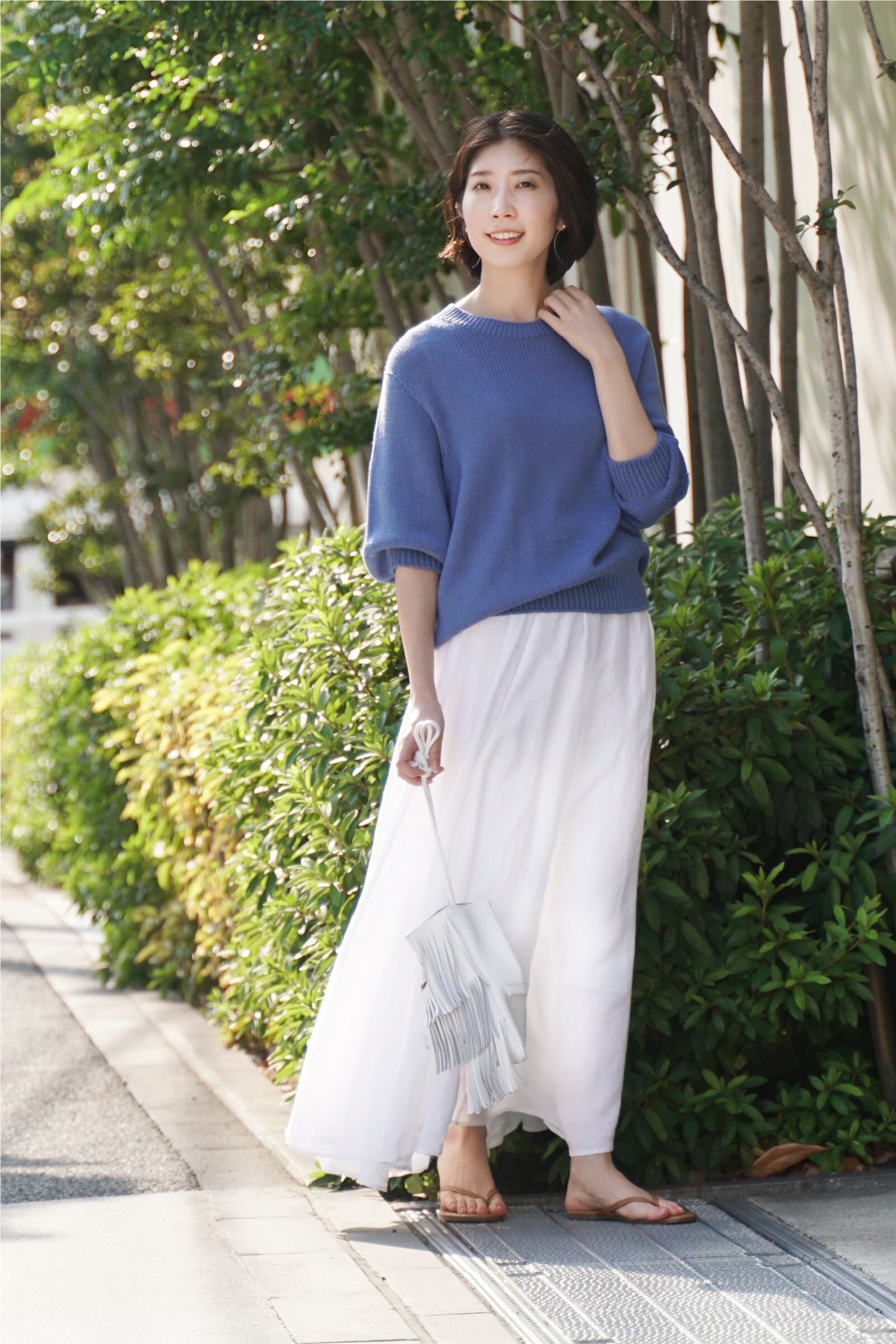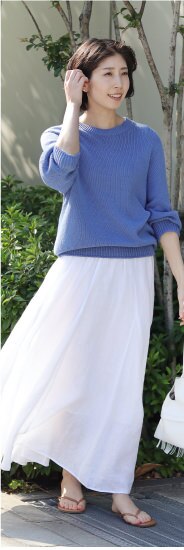 スタッフコーデはこちら存在感のあるスカートに鮮やかなブルーニットのコーディネート。カジュアルなカラーに見える濃い色のブルーには、ホワイトのロングスカートで清涼感を与え、素肌感のあるサンダルでコーデを馴染ませるのがポイントです。