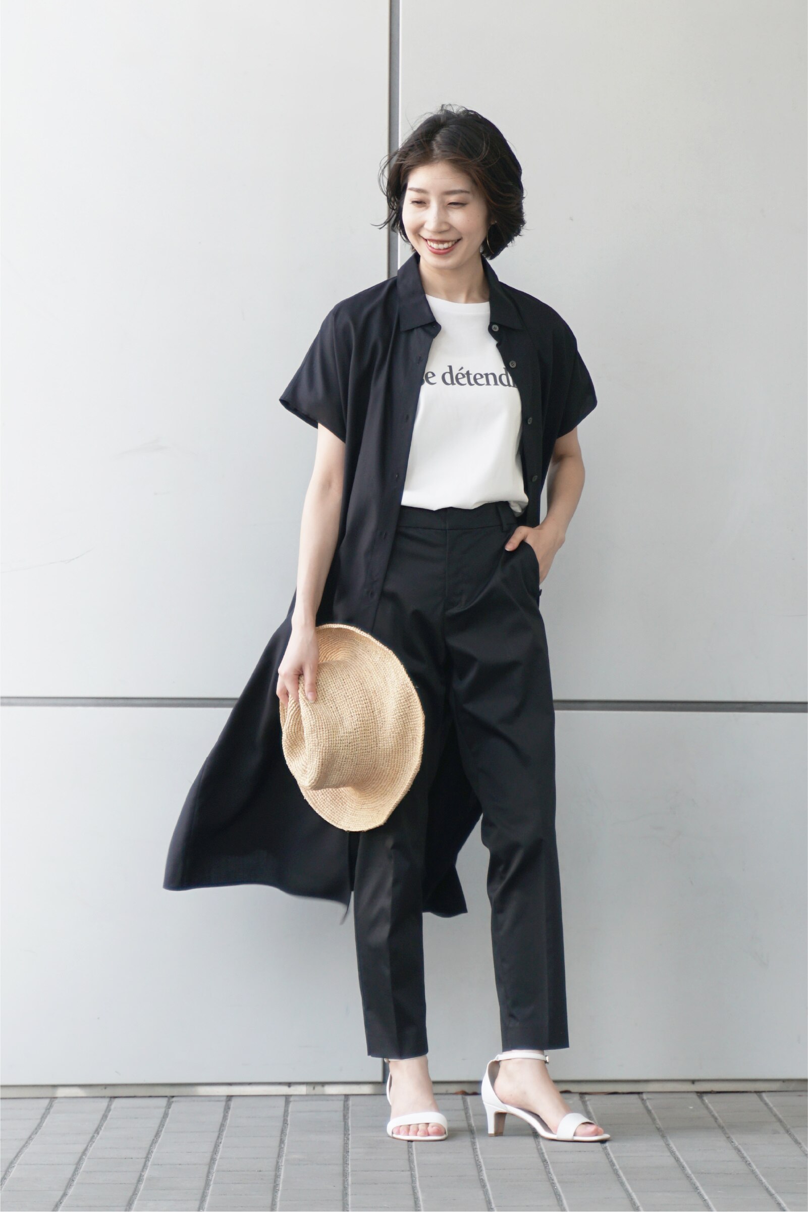 スタッフコーデはこちら黒の洋服はついつい増えがちなアイテム。夏は同じコーデになりがちに。でも今回はワンピースをジレ感覚でロゴTシャツに合わせてみました。全身ブラックで強調しすぎない様に、足元のサンダルに女性らしさをプラスするのがポイント。