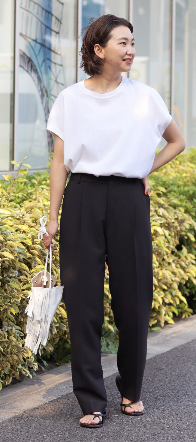 スタッフコーデはこちらブラックのテーパードパンツは ワードローブに一本持っていたい、そんなアイテム。ハイウエストシルエットで足を長く綺麗に見せれくれるこちらのパンツはトップスの形を選ばすどんなアイテムとも組み合わせていただけます。