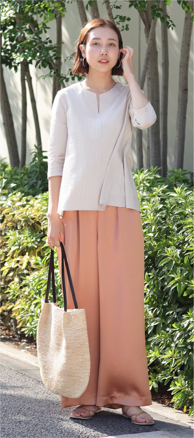 スタッフコーデはこちら上下ベージュ系でまとめた今年らしいコーディネート!夏に活躍するシアサッカー素材のトップスはウエストに切り替えがあるので着やせ効果が叶う嬉しいアイテム。同色のサテンパンツを合わせたリラックス感のあるコーディネートがおすすめです!