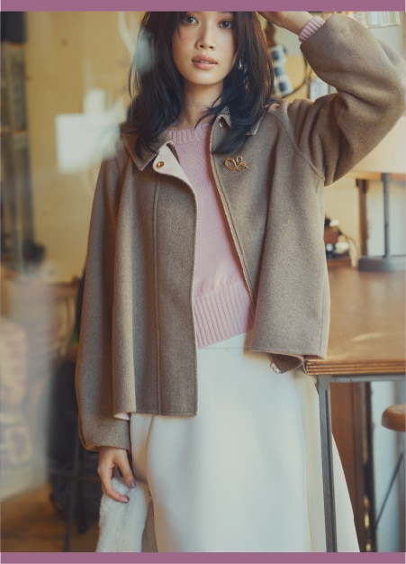 今年らしさ満点のリバー仕立てのコートは、ボリューム感あるスリーブや大きめの襟、バックスリットデザイン、丸みのあるフォルム、と全方位可愛いシルエット。ゆるさはありつつ、コンパクトなレングスなので、スカート派にもおすすめの一枚です。コートの内側カラーとニットのピンク色をさりげなくリンクさせ、やわらかで優しい色合いを楽しみたい。