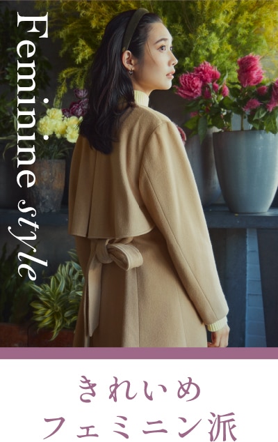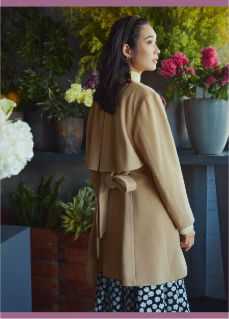 まろやかで優しげな印象を与えてくれるベージュコートは、ノーカラーデザインで一層エレガントに。花柄スカートとカラーニットのほんのり甘さのあるスタイリングも、上質ウールで大人の装いに。共布ベルトを後ろでギュっと絞ると、より女っぽさが際立ちます。羽織るだけで決まる計算されたフォルムは、着る人を品よく美しく見せてくれます。