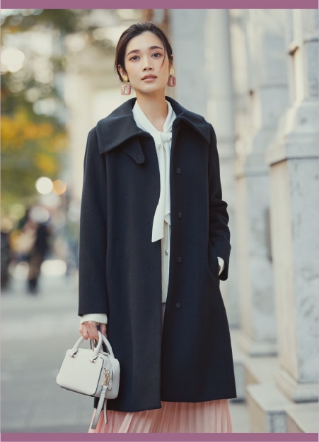 ベーシックなデザインながら、小顔に見せてくれる大きめの襟、すとんと落ちるⅠラインシルエットなど、防寒しながらすっきり見えを叶えてくれる一枚。きちんと感が求められるお仕事シーンにもぴったりです。ボウタイ×プリーツスカートでつくる、クラシカルな好印象スタイルに、シックなネイビーコートを合わせることで知的でモダンなムードに。