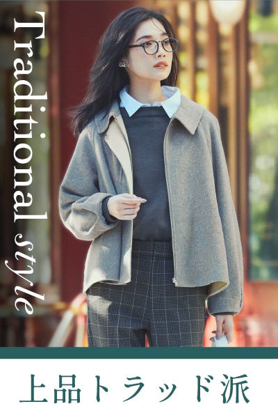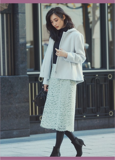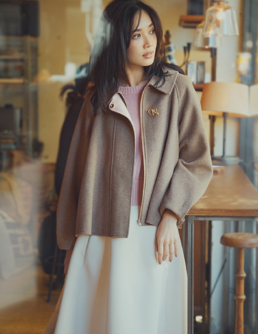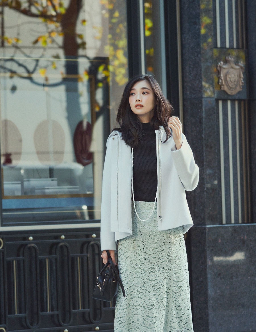 毎年大人気のショートコートは、上質なラムウール素材を使用しているため、しなやかさと発色の良さがポイント。白に近いアイスグレーは、品よく見せつつ、白より新鮮で今年らしい。ジャケット感覚で使える淡色アウターに、セージグリーンのスカートを合わせた冬のフェミニンスタイルには、黒アイテムをトッピングして、少し辛めに仕上げるのがおすすめ。