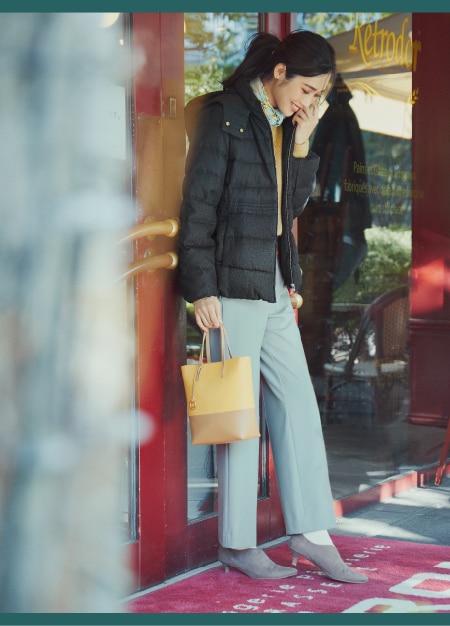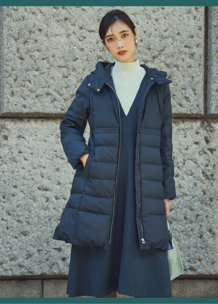 本格的な冬を迎えると、やっぱり頼りになるのはロングダウン。ほどよくシェイプされたウエスト、高めの位置に入ったステッチ、スリット感覚でサイドに入ったファスナーなど、計算しつくされたデザインで、ロングダウンでもすっきり美シルエットが実現。ミントグリーンとネイビーをニュアンスカラーで繋いだ、大人シックな色合いが都会的なスタイル。