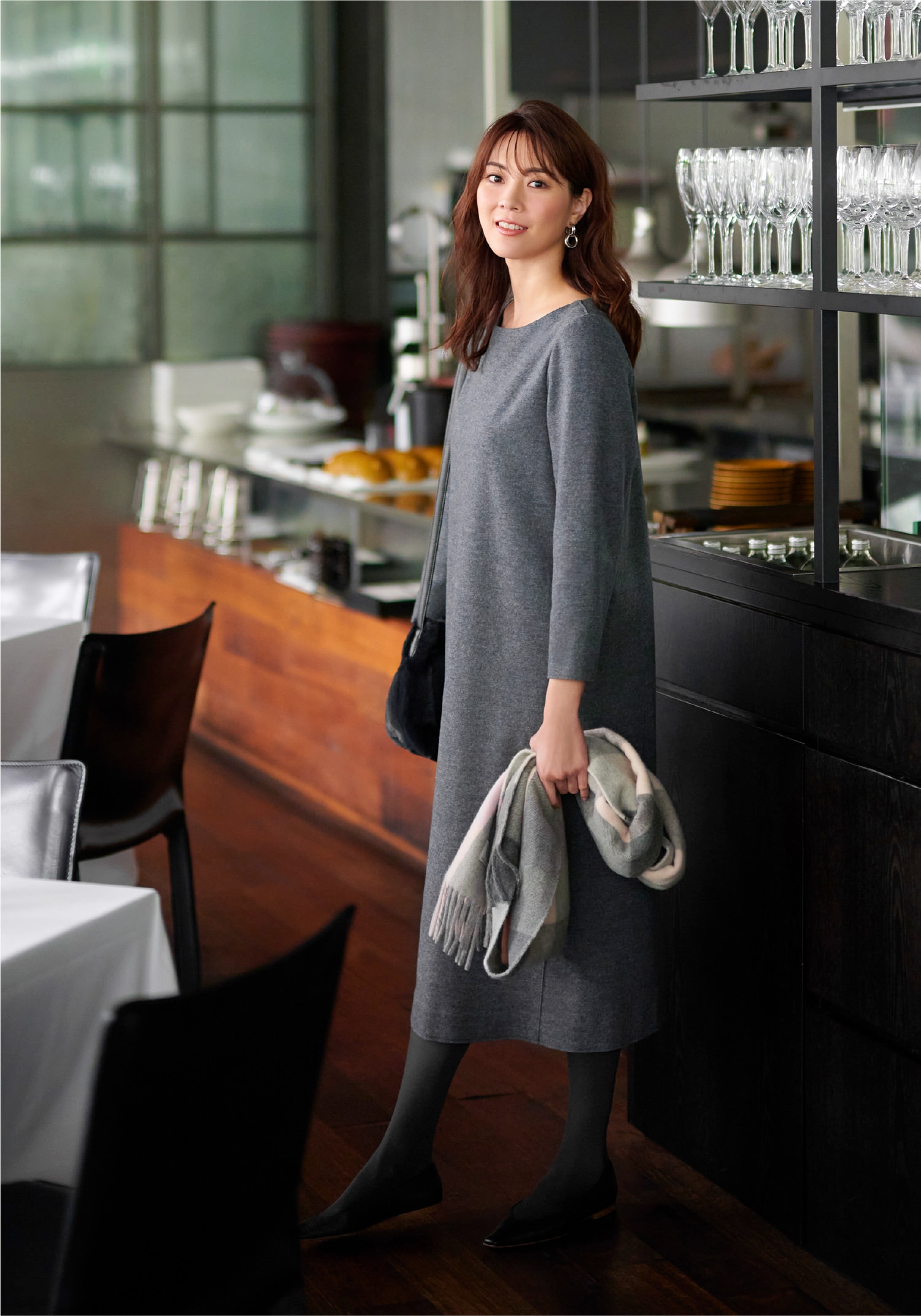 チェックのストールをサッと羽織って