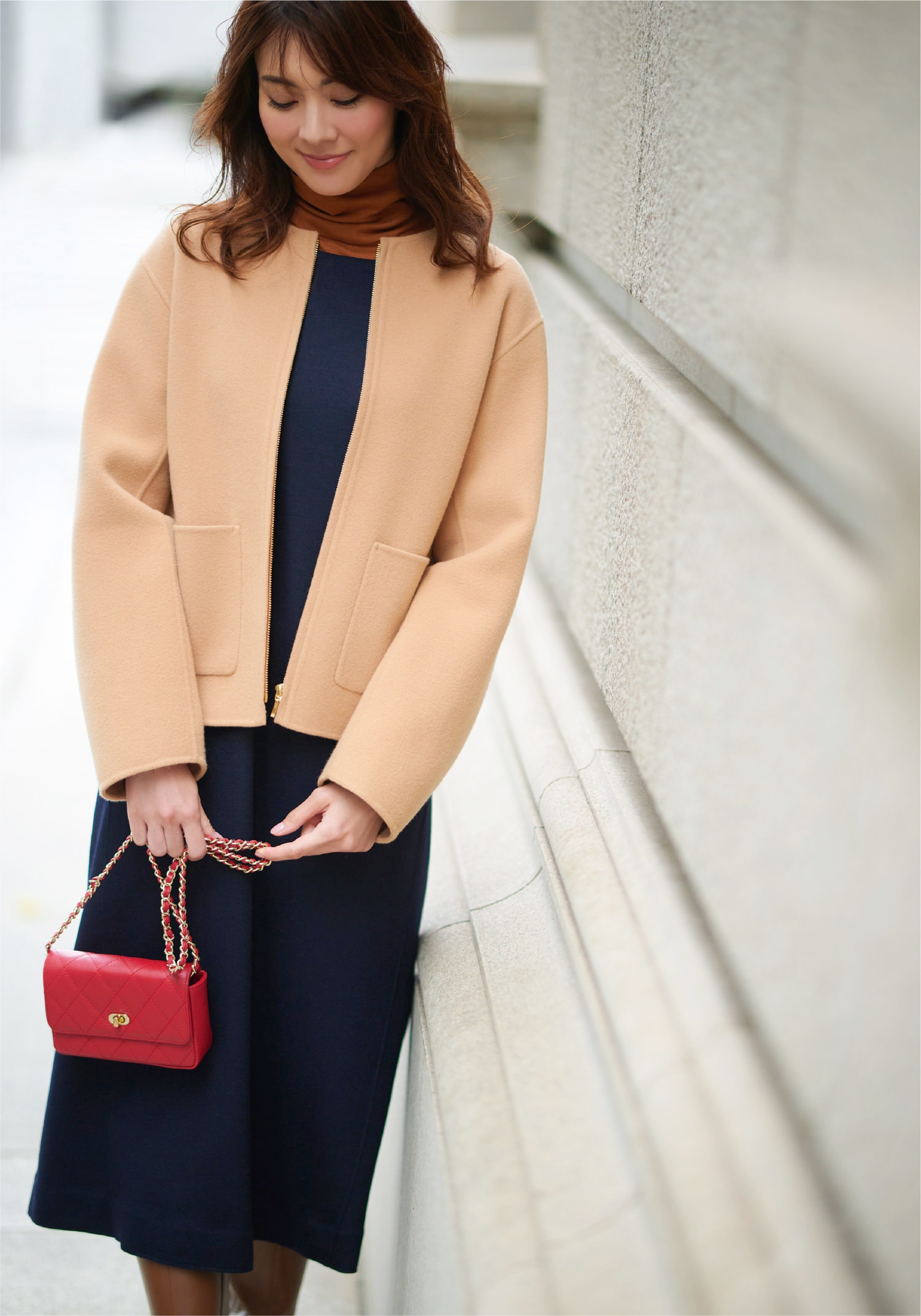 美しい発色のコートを合わせる。