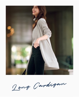 大人のデートにはわかりやすい色気よりも、空気感に女性らしさを漂わせたい。そんな時はラウンドヘムシルエットで柔らかなショールカラーのカーディガンが重宝します。動物・環境に配慮したサステナブル素材で意識が高いオシャレができる女性はより魅力的。