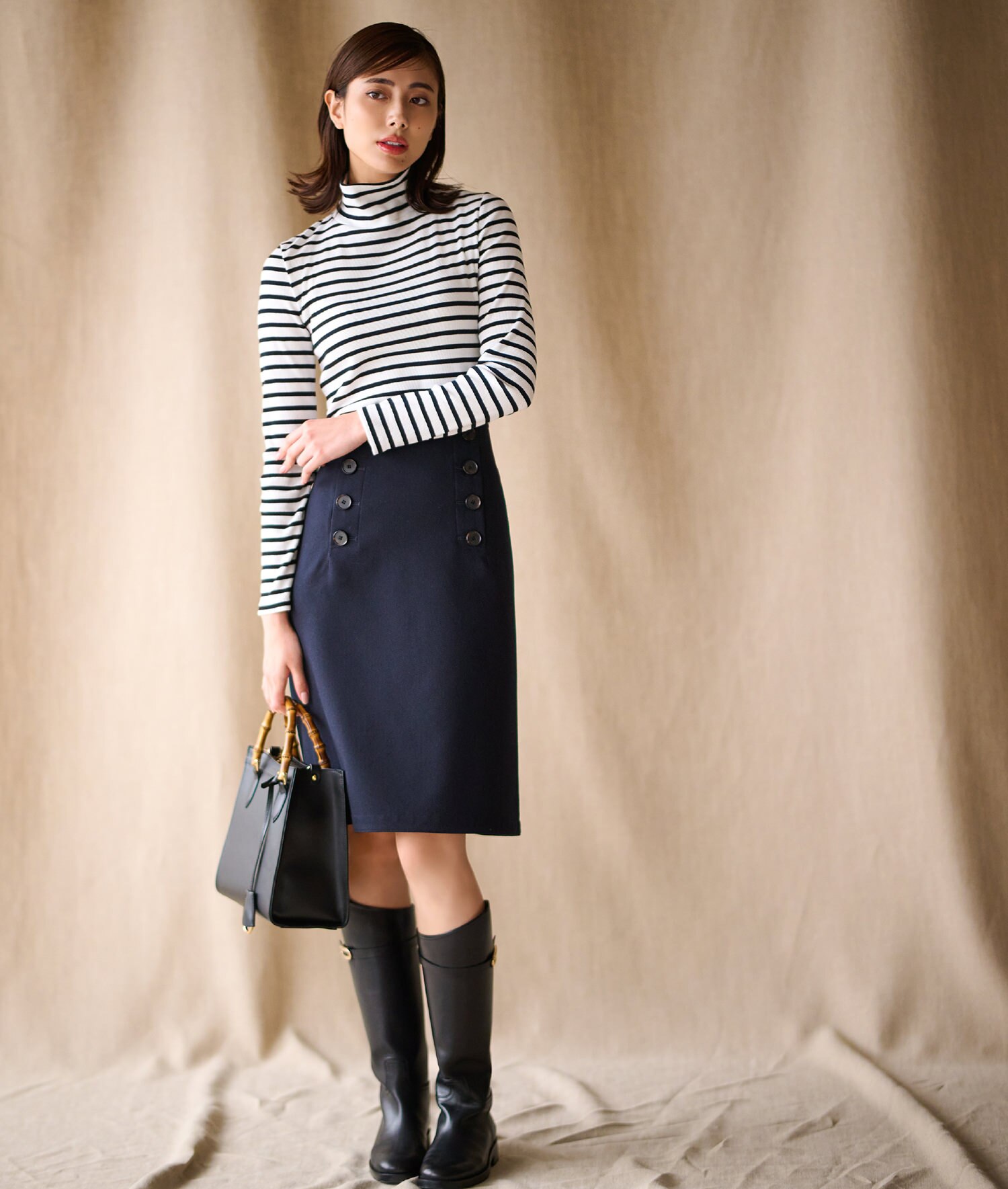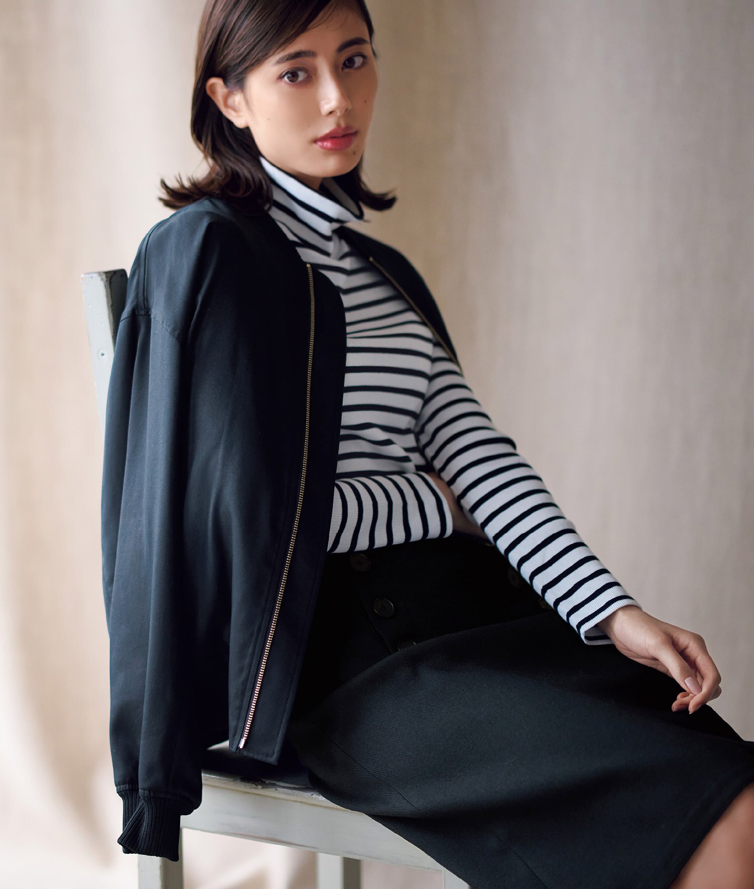 程よい光沢と落ち感のある素材ですっきりと女性らしく着られる1着。ボーダー合わせでフレンチシックにも、カーデ感覚で通勤にも使える汎用性のあるブルゾンです。