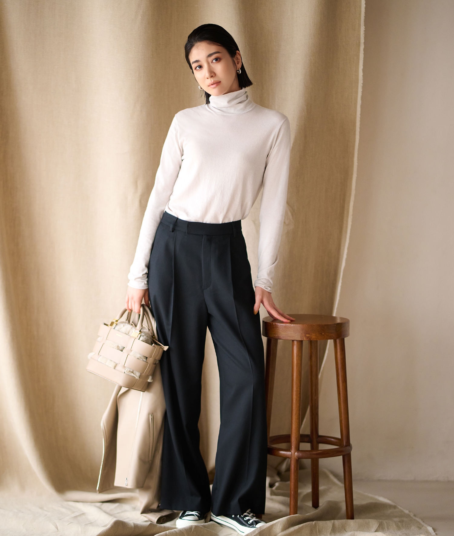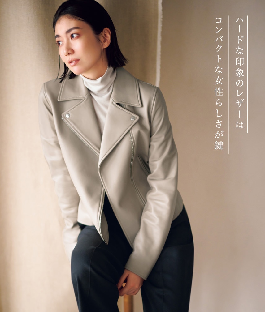 着れば着るほど体に馴染む23区のために開発されたラムレザーは、しっとりとした肌ざわりと程よい弾力で着心地も秀逸。他では出合えない、絶妙な上品カラーに豊富なサイズ展開にも注目して。