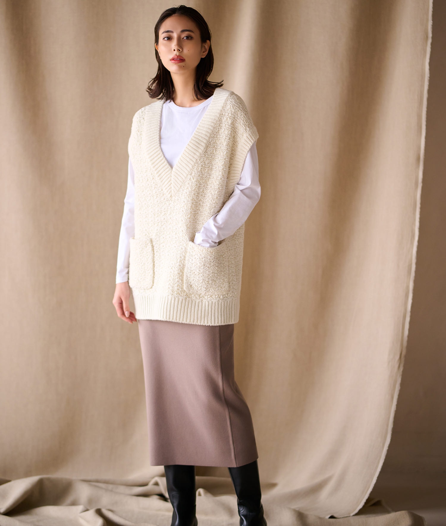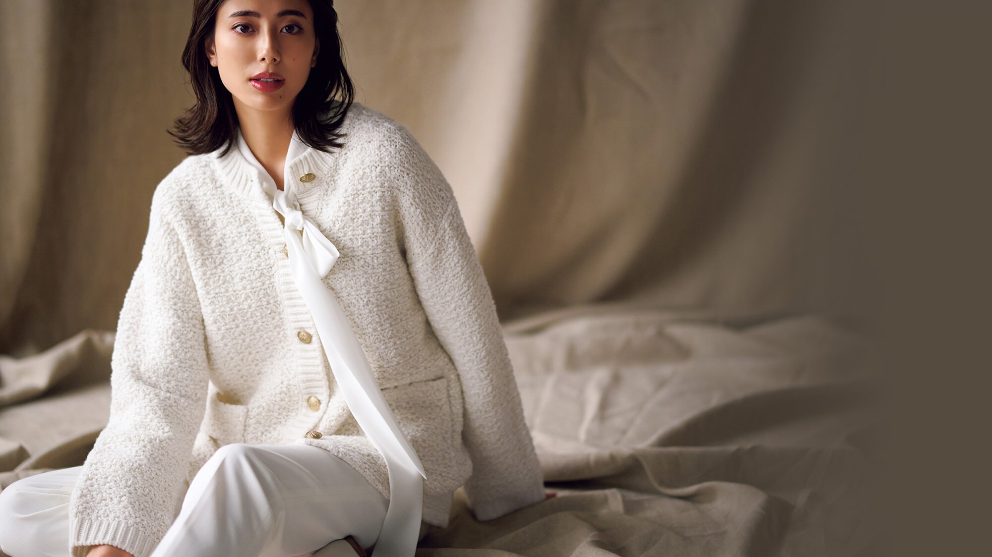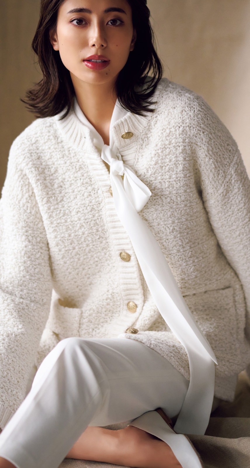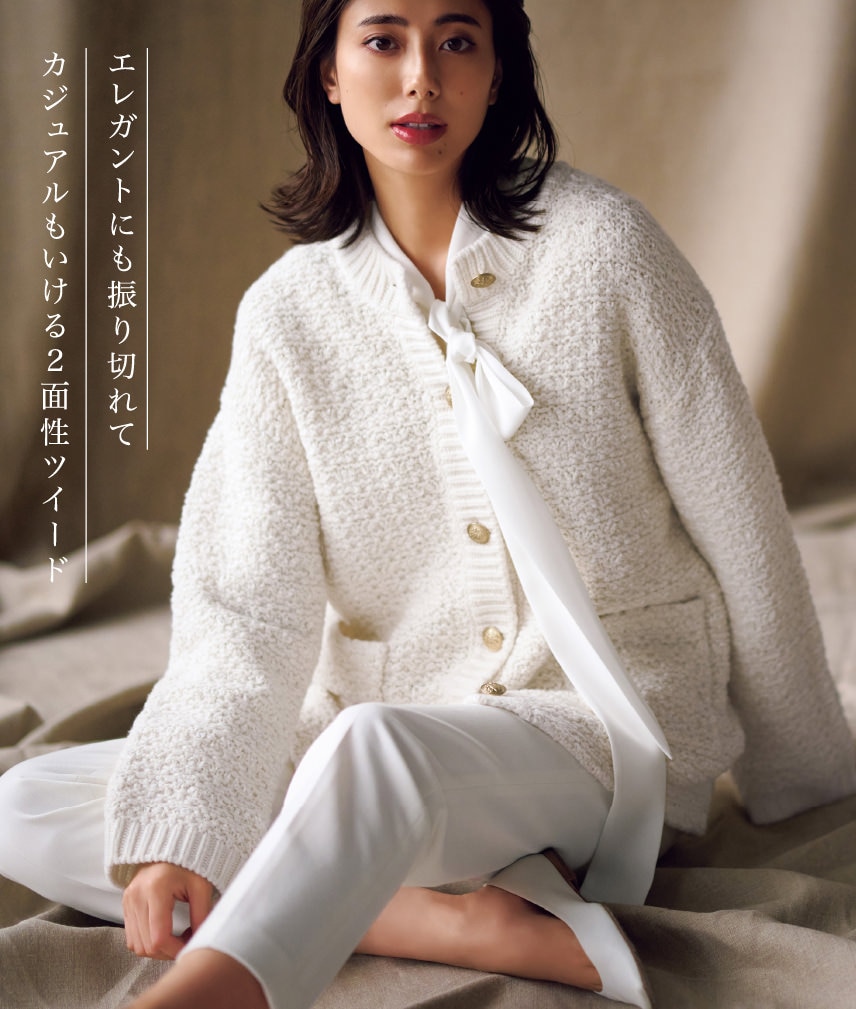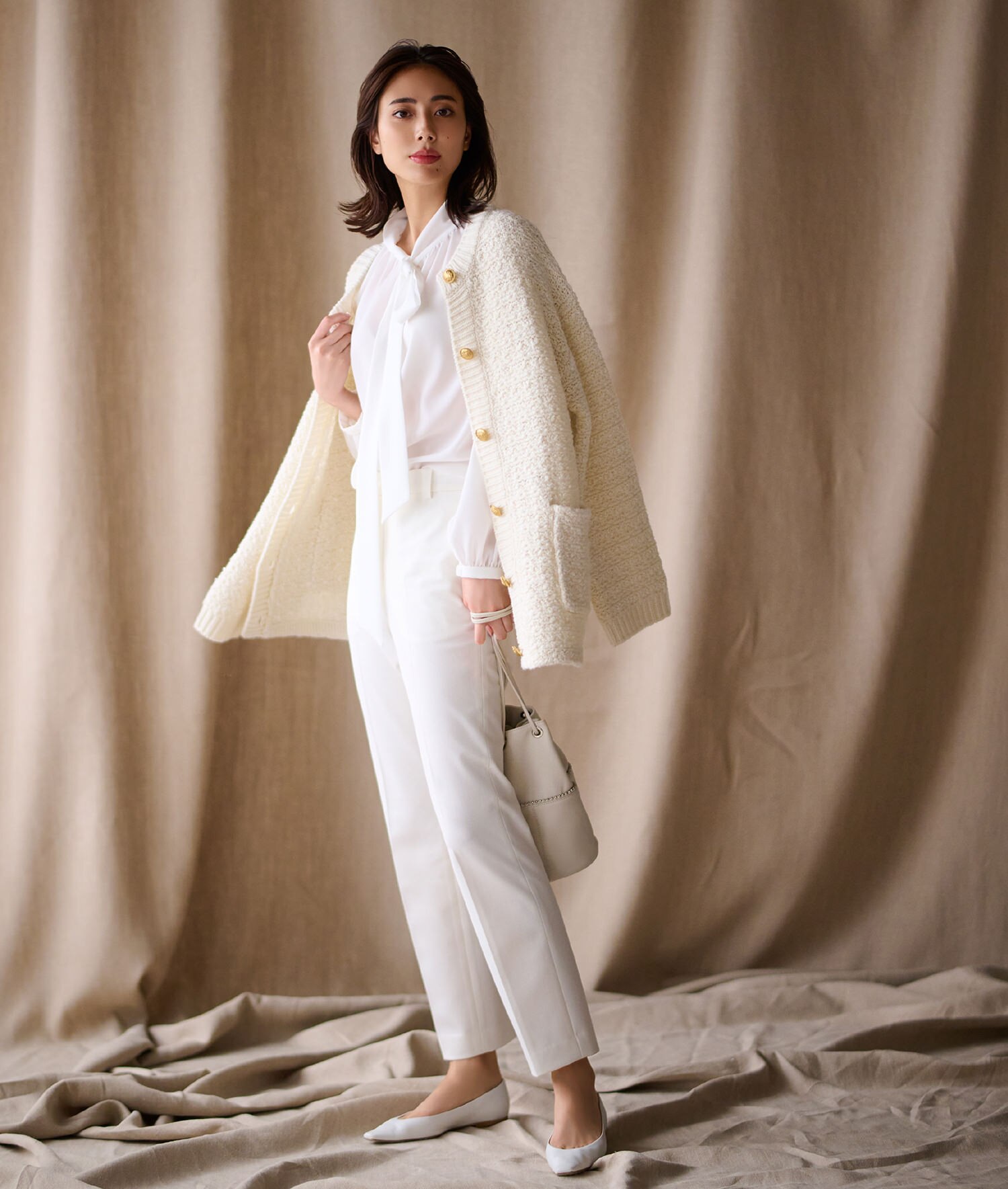 トレンドのツイードジャケットをニットで表現したあたたかみのあるカーディガン。金ボタンがオールホワイトコーデのアクセントとなって華やかで着映えするスタイリングに。