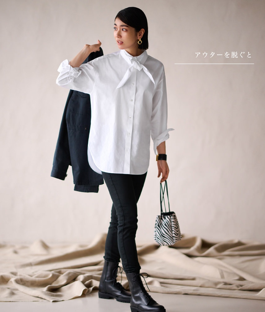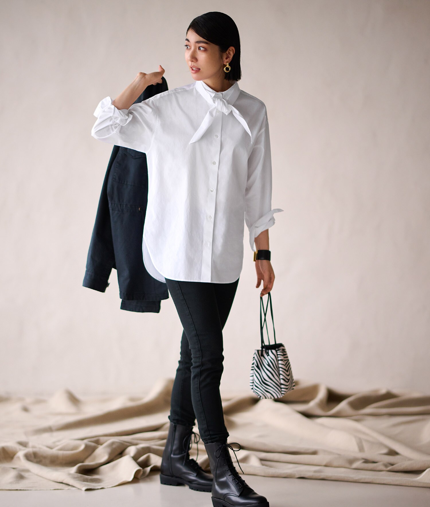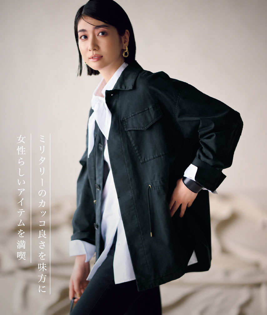 ユーズドの風合いが魅力のメンズライクなブルゾンがきれいめシャツやスキニーパンツの女性らしさを際立たせます。ビッグシルエットなので重ね着してももたつきません。